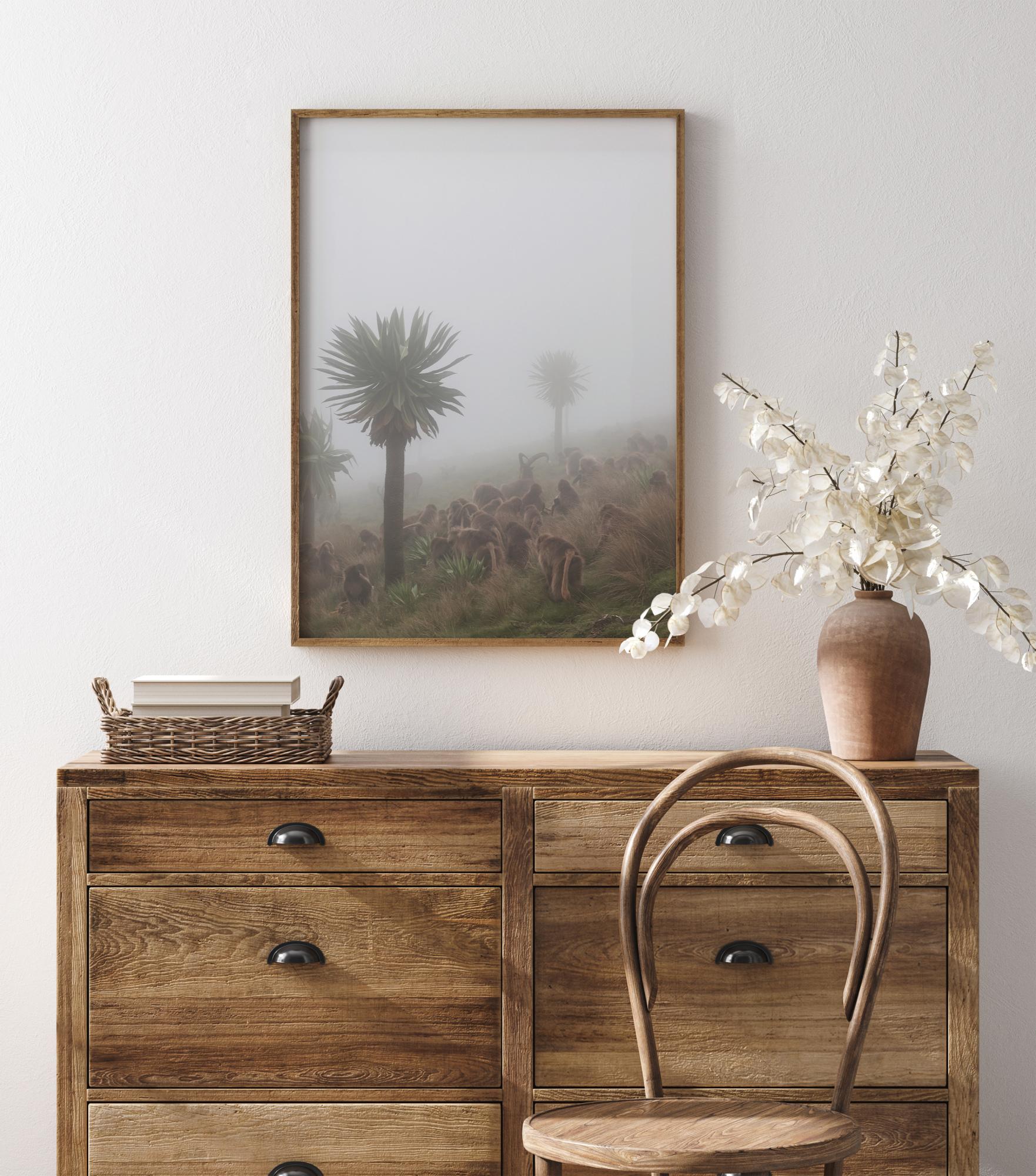 Плакат на тема дивата природа с група павиани и една самотна козица в центъра им. Тази група животни е разположена на мъглив планински склон с различни дървета, които се простират нагоре. Сцената е спокойна и мирна, докато тези животни си почиват през деня.