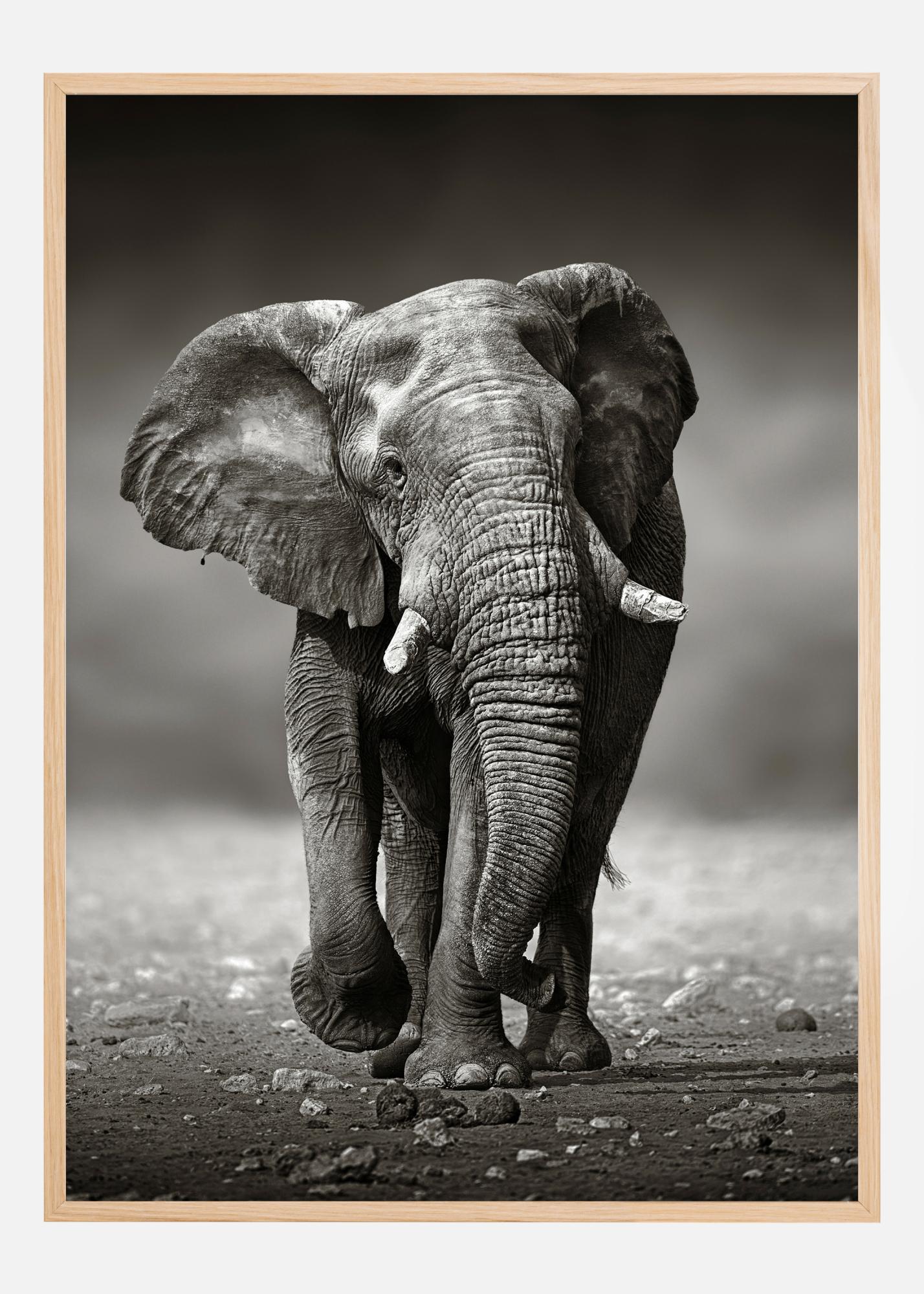 Една великолепна постер с черно-бял слон. Слонът е в средата на стъпката си, когато се движи към камерата. Той изглежда млад с къси бели бивни и спокойно изражение на лицето. Посетете Африка, когато се възхищавате на тази снимка, когато тя виси в дома ви.