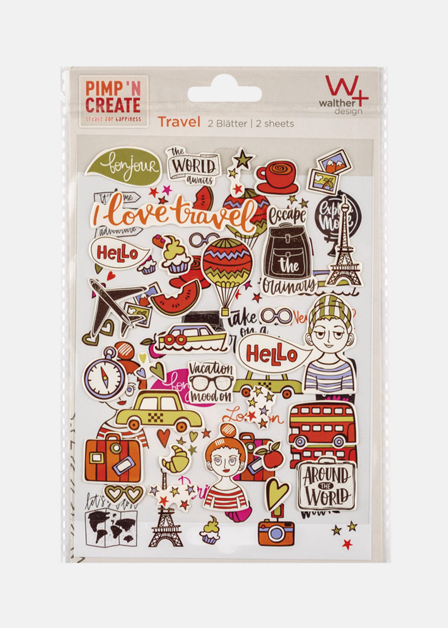 Самозалепващи стикери с мотив за пътуване. Перфектни за креативен дизайн на фотоалбуми, за декориране на подаръци или за създаване на поздравителни картички. Опаковката съдържа 1 лист 3D стикери и 1 лист плоски стикери.
