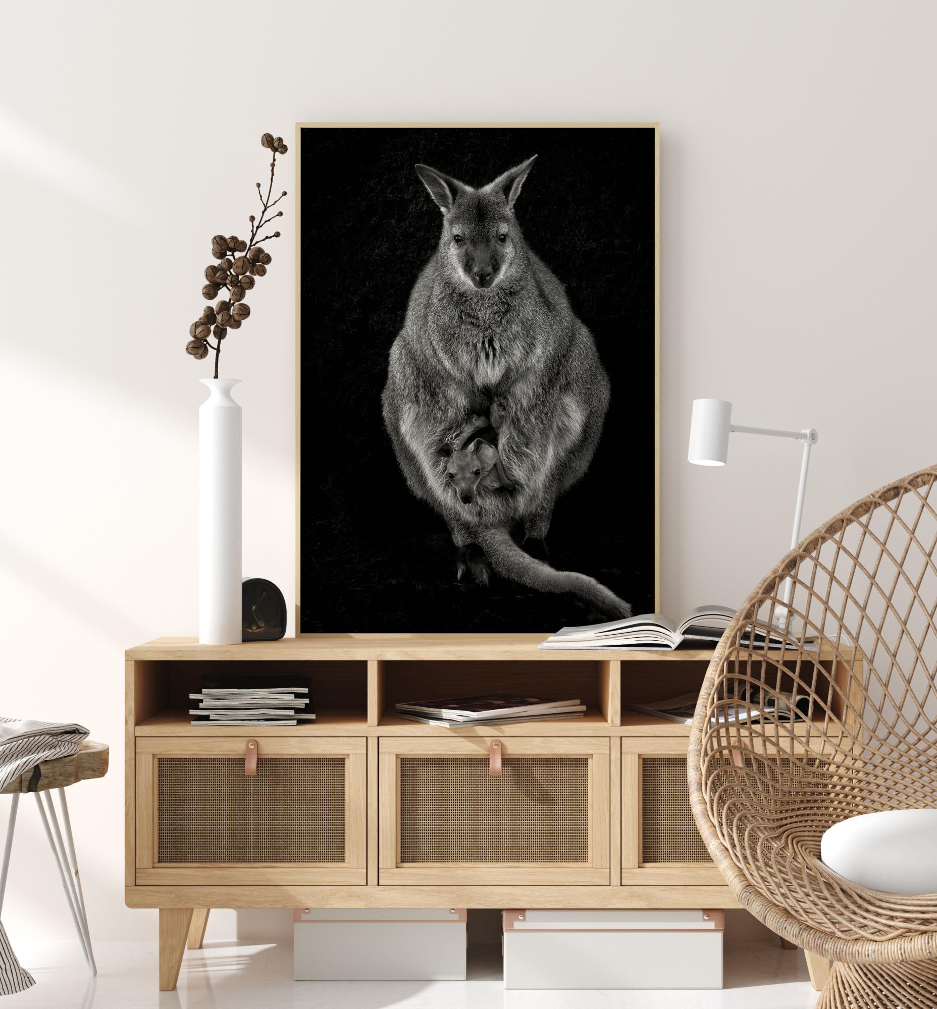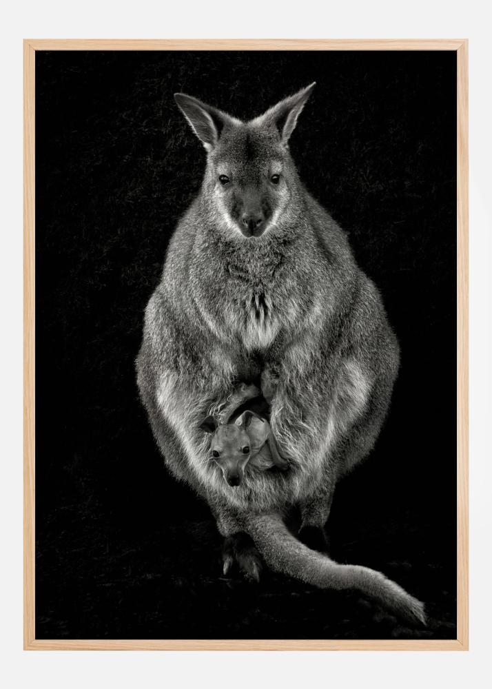 Постер с природа с валаби и нейното бебе. Двойката изпъква в зашеметяваща картина на черен фон. Почувствайте това сладко, меко усещане, когато гледате тази майка и нейното дете.