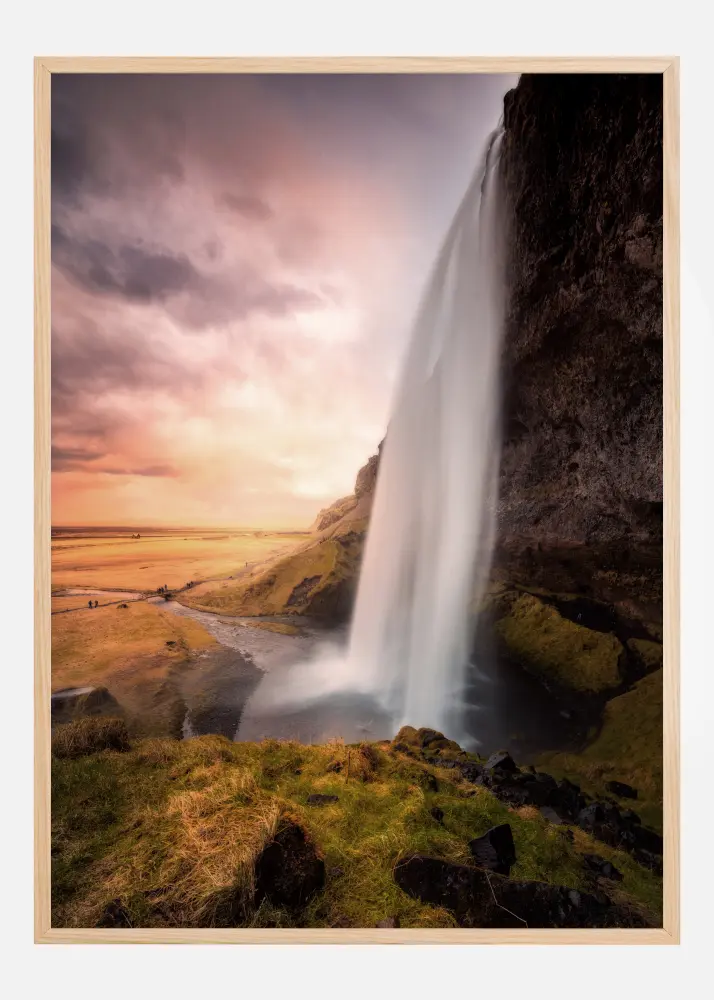 Плакат с висок водопад, който се спуска в езерото отдолу. Около водопада има меки затревени хълмове и обширна равнина. За да се подсили магическото водно течение, има лилаво и синьо небе, което осветява величествения водопад, когато пада над скалата. Почувствайте суровата сила на природата.