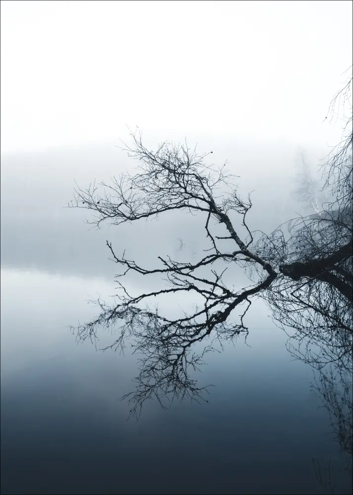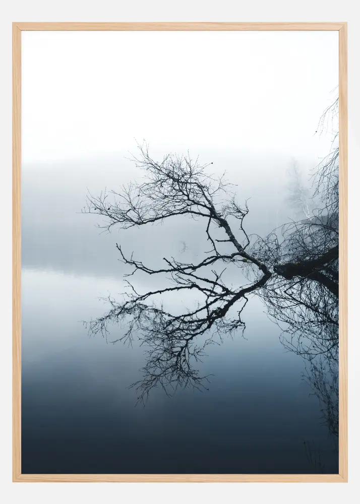 Бял постер с широко спокойно езеро с мъртво дърво, което се издига от водата. Когато клонът се извива нагоре, той хвърля своето отражение върху езерото и създава невероятно огледално изображение. Бялото небе отгоре помага да се отличи истинският клон от неговото отражение. Сините тонове придават по-хладно усещане на топлата стена.