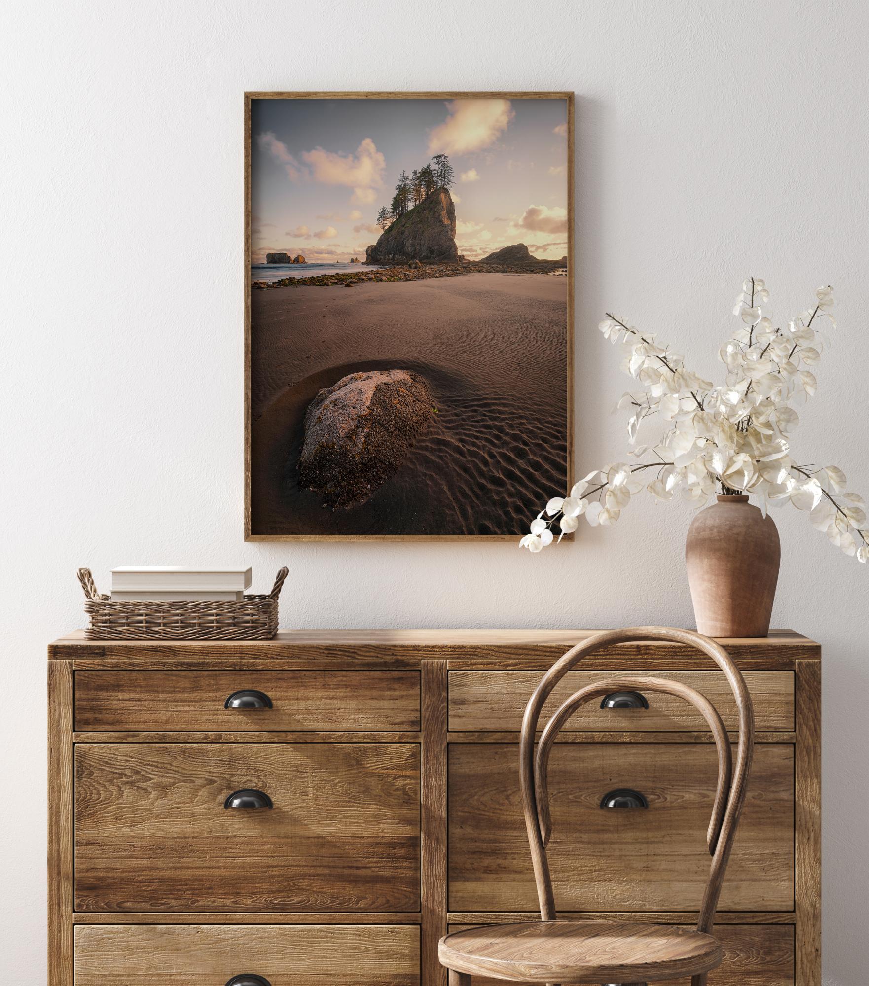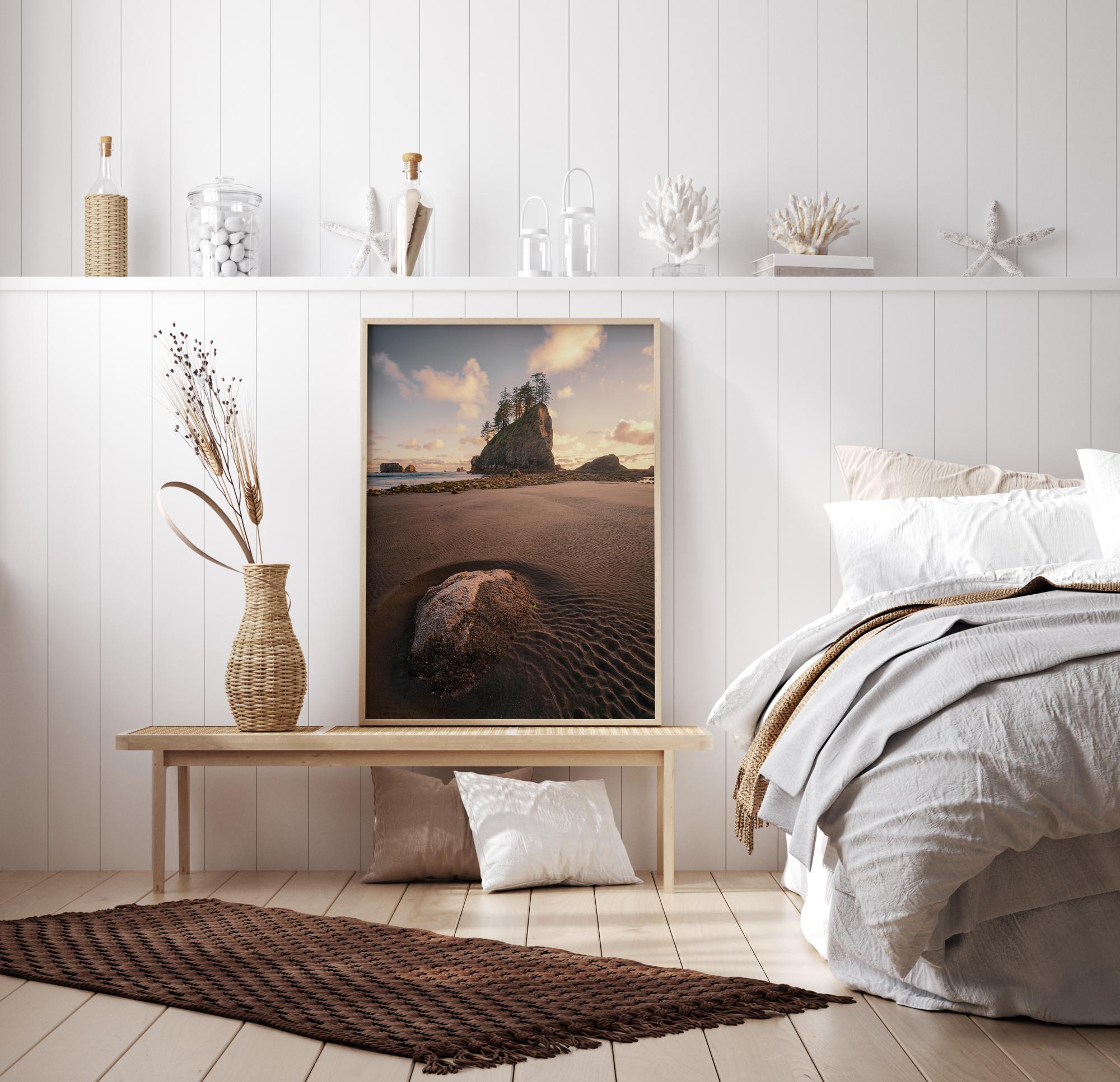 Естетичен постер с кадър отблизо на плажа. Ниската ъглова перспектива ви приближава до пясъка, където можете да следвате следите от вода, които са се образували от локва. В далечината се издига покрита с дървета скала от морето към меко синьо небе, изпълнено с пухкави бели облаци.