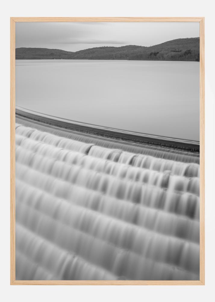 Сив плакат с малки водопади, които падат над изкуствено езеро в езеро. Спокойната сива вода се простира с малките водопади, които текат над малките первази, за да създадат бързо движещ се модел. Отпуснете се и нека погледът ви следва водните потоци, докато текат надолу.