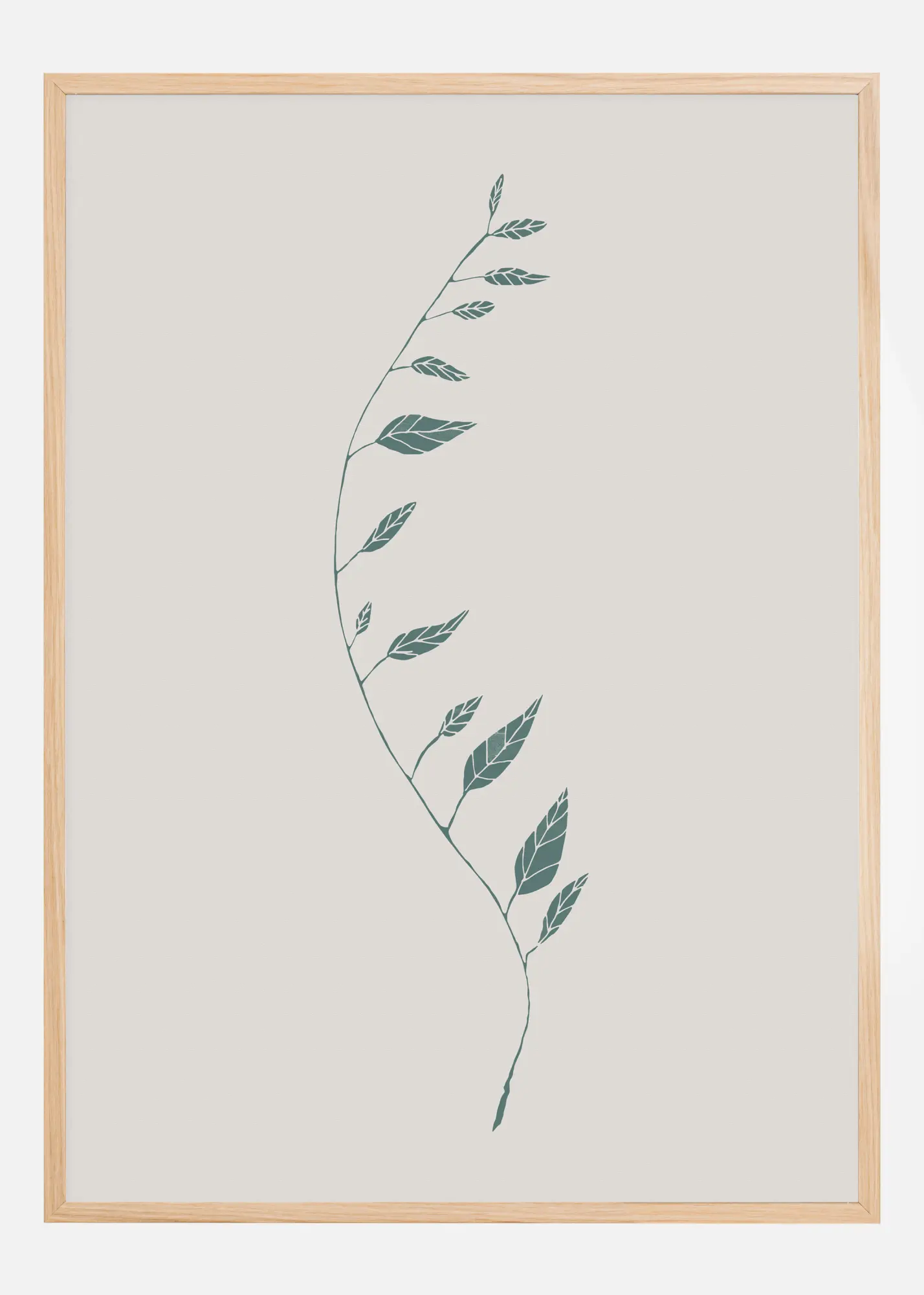 Минималистичен плакат с дълъг зелен клон, който се люлее леко на бял фон. Тънката линия на клона вълнообразно и нежно се огъва, всички листа са на една страна, сякаш духа вятър, който ги отвява. Неговата простота създава усещане за спокойствие, идеален за релаксираща баня атмосфера.