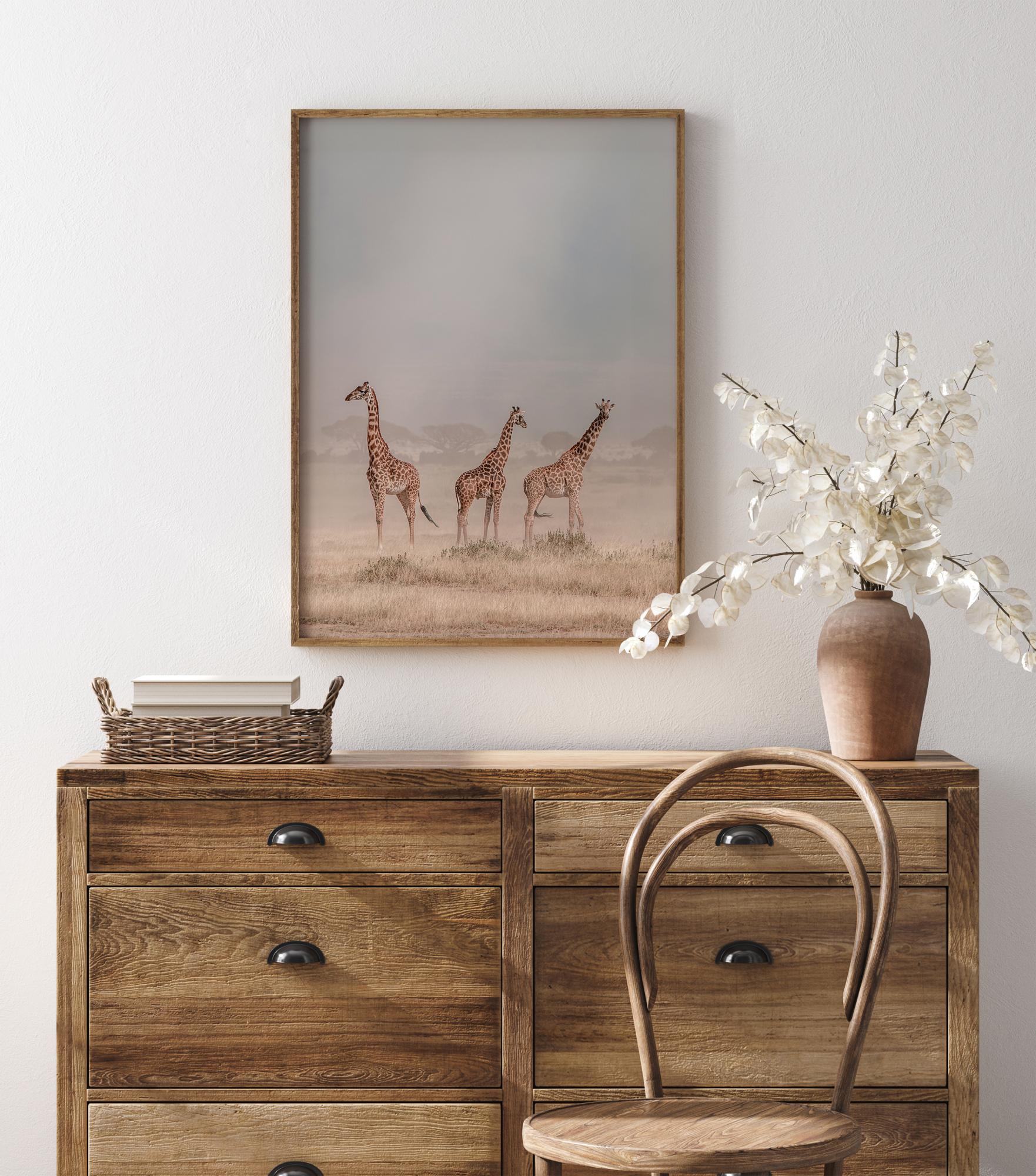Едно красиво изразяване на дивата природа с три жирафа на африканската савана. Жирафите гледат в различни посоки, докато се борят срещу прашните ветрове на Amboseli, които се издигат в спирали и създават мъгляв ефект. Посетете Африка, без да напускате дома си с този емоционален постер.