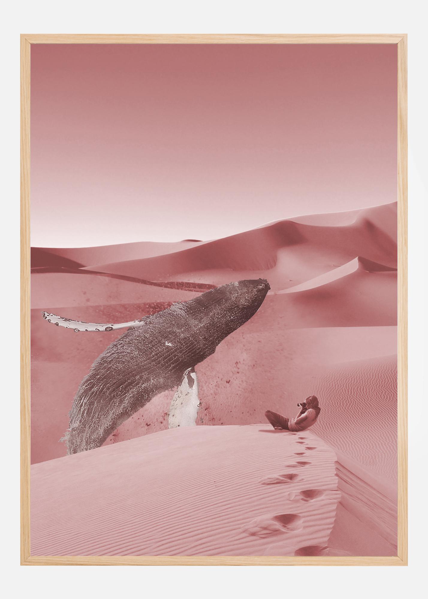 Помечтай за сюрреалистичен свят с този артистичен постер, където мощен кит излиза от променящия се пейзаж на розови пясъчни дюни. Тази неочаквана комбинация от морския гигант и вълнуващите хълмове на пустинята предизвиква реалността и привлича зрителя в един фантастичен свят. Розовият оттенък, който пронизва изображението, дава усещане за спокойствие и игривост, докато ясните следи от стъпки ни водят в история, която чака да бъде изследвана.