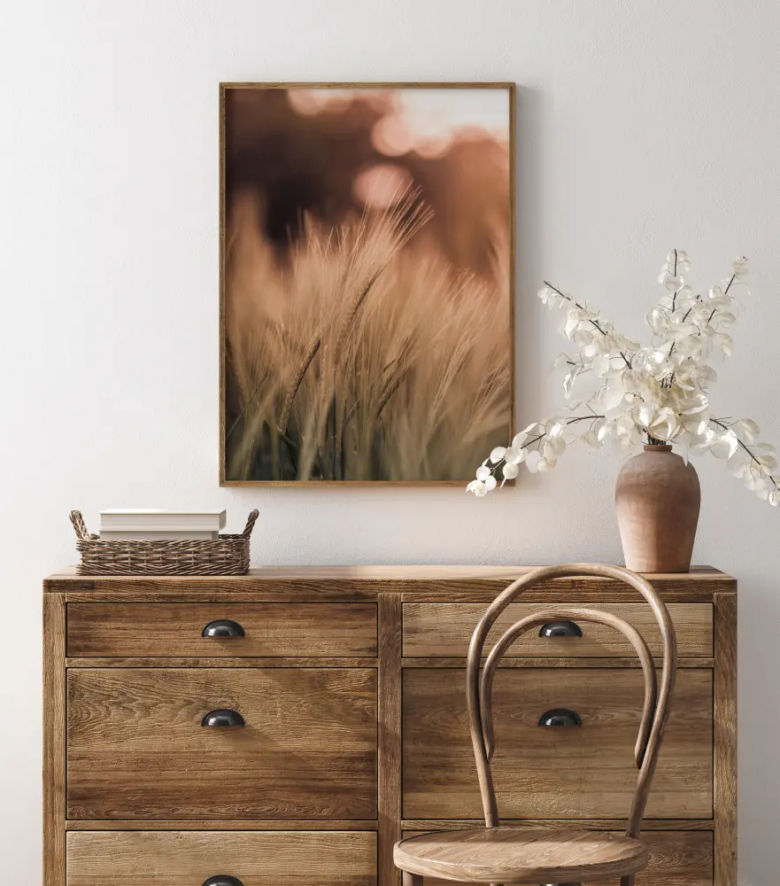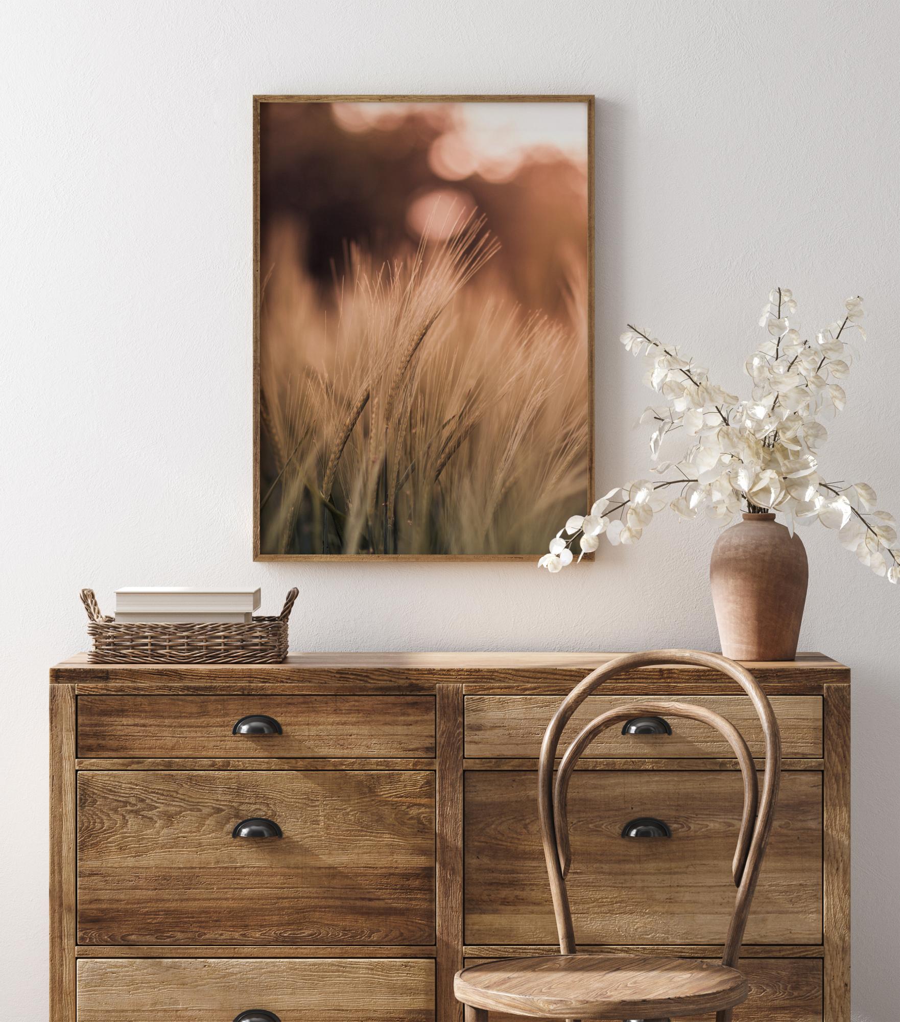 Меко плакат с житни класове в късното следобедно слънце. Меката розова светлина осветява златните житни класове и създава мека, почти магична картина. Превърнете ежедневното в нещо красиво, като окачите този принт на мека неутрална стена, за да създадете усещане за спокойствие.