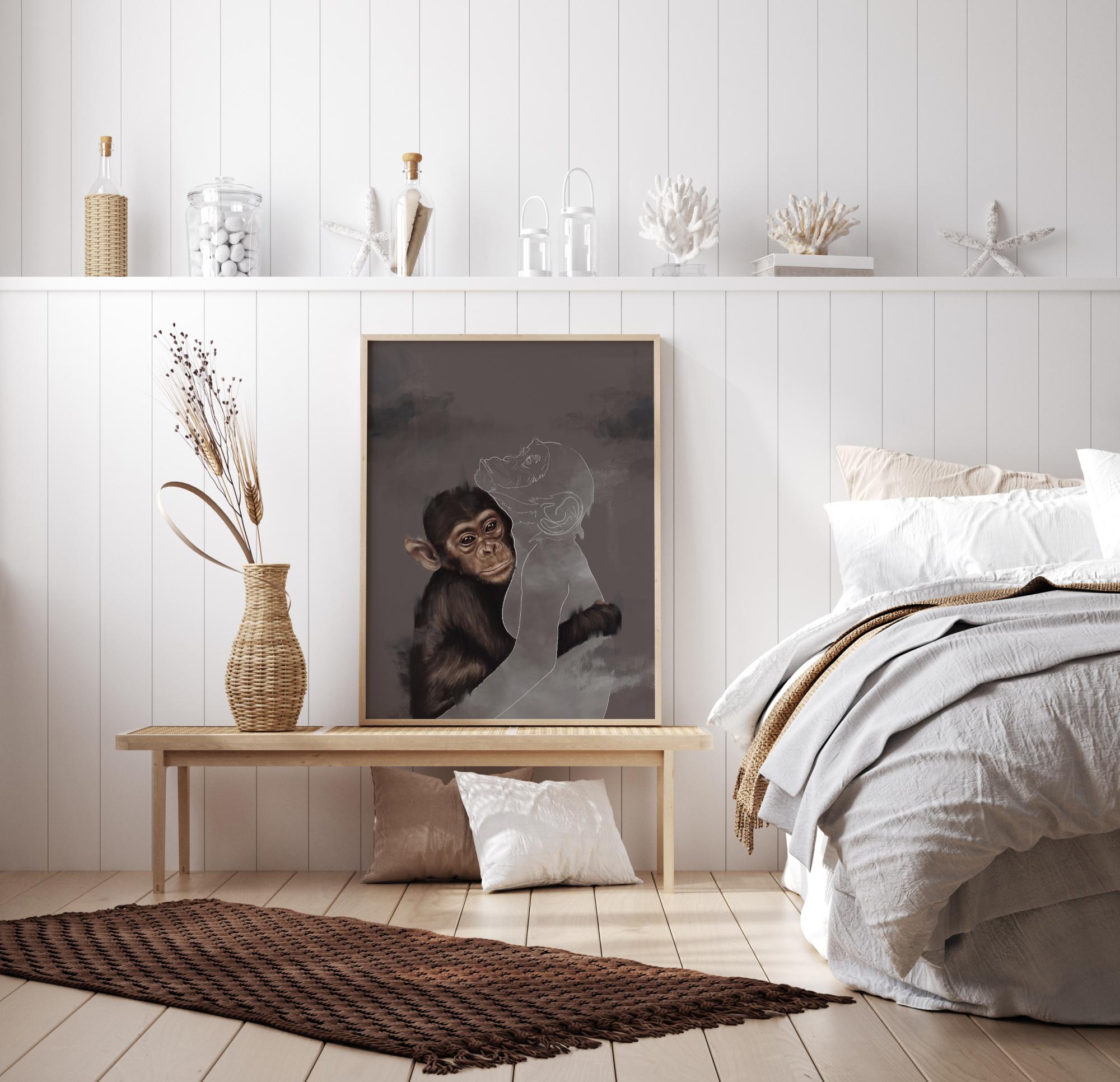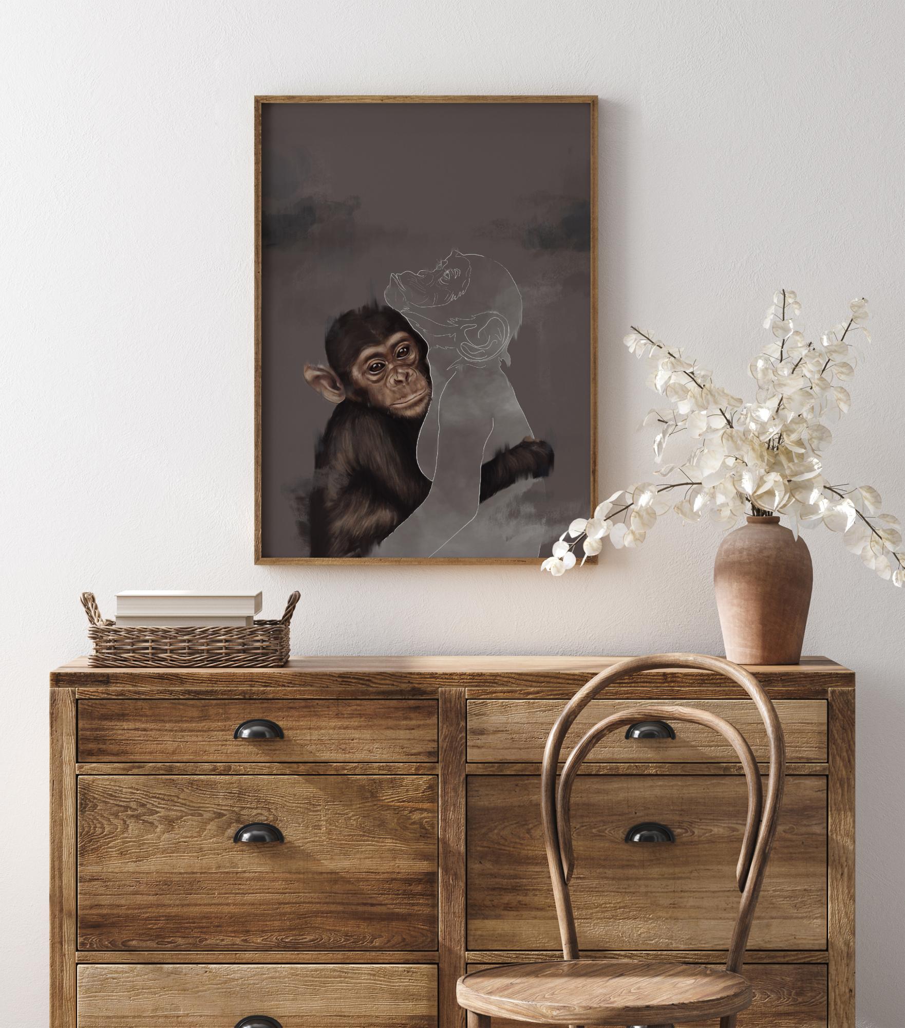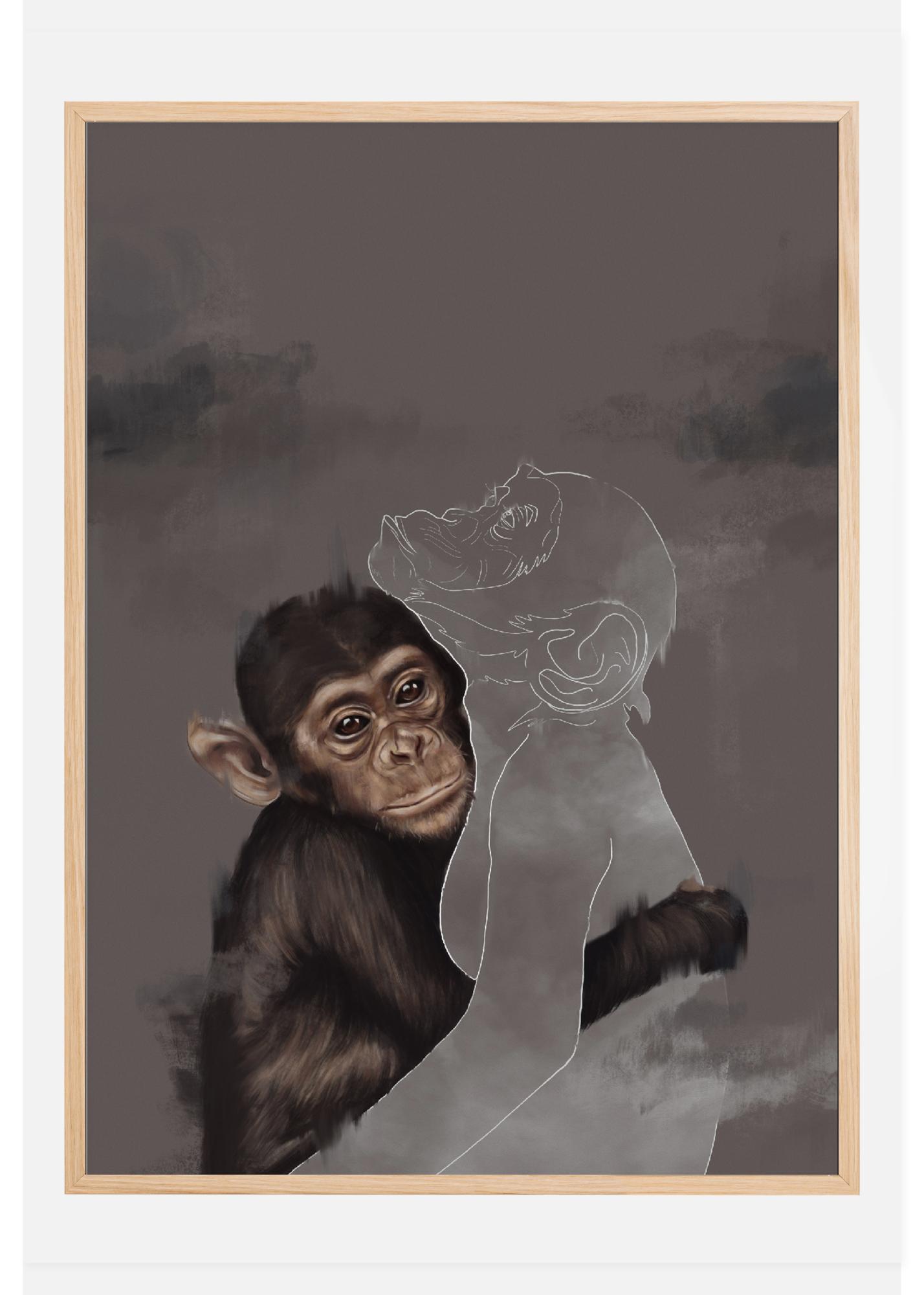 Един невероятен постер в смесен медиум с млад шимпанзе, което прегръща друго шимпанзе в контур. Тази емоционална картина има детайлна рисунка на шимпанзе, което обгръща с ръка белия контур на друго шимпанзе. Вторият липсва, така че къде е другата маймуна и защо вече не е там?