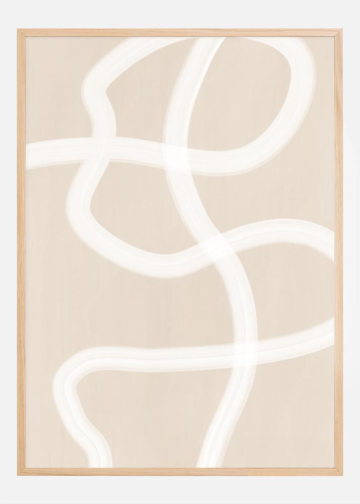 Тази постерна с sweeping бели четки върху топъл бежов фон предлага завладяваща и съвременна естетика. Нейните течащи линии и органични форми придават усещане за движение и спонтанност, като същевременно запазват изчистено и чисто усещане, което е типично за съвременния минималистичен дизайн.