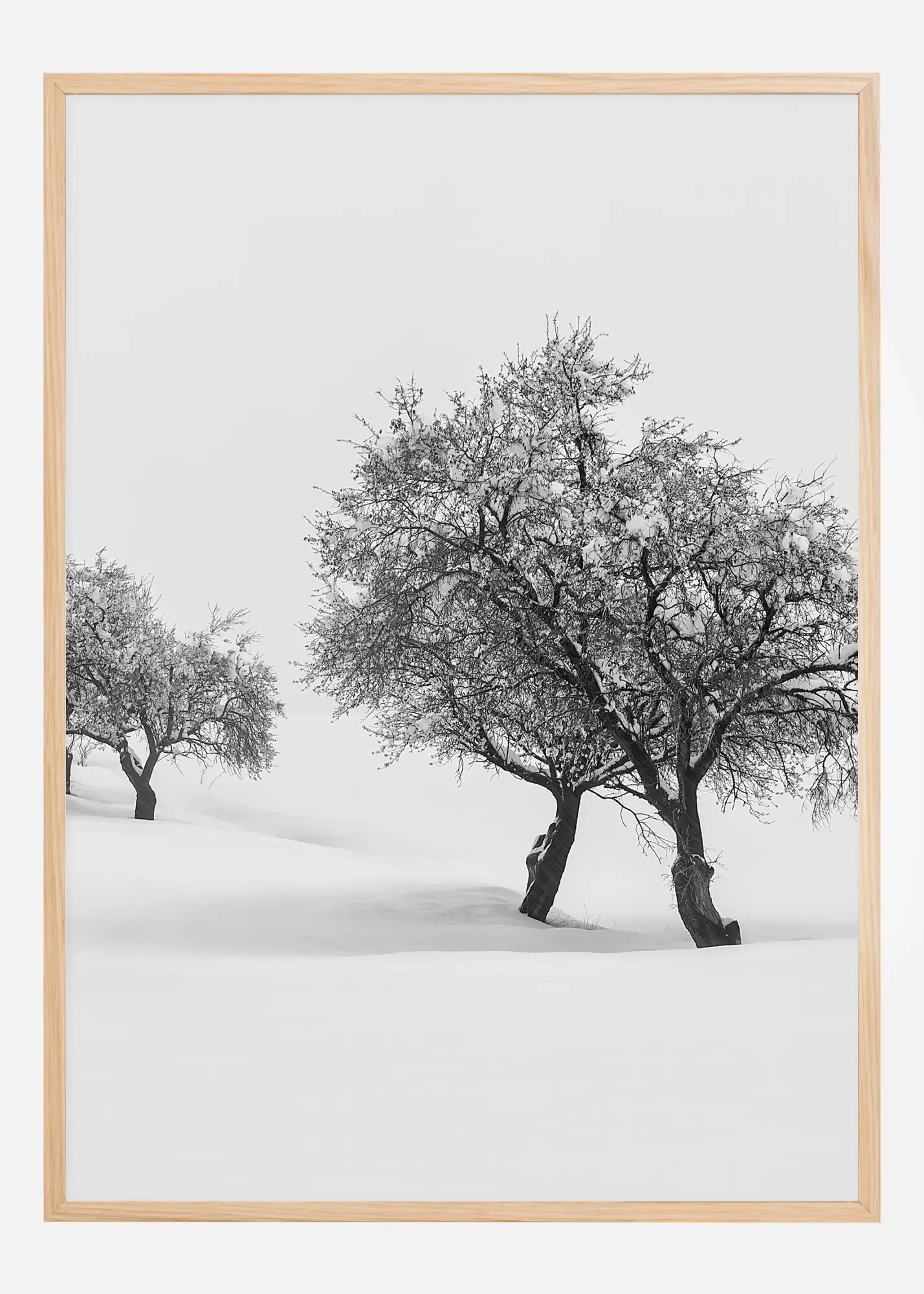 Снежен постер с дървета, които пробиват през заснежен пейзаж. Гладката бяла сняг се простира, докъдето очите могат да видят. Черните стволове и клони изпъкват по удивителен начин на фона на белия сняг и небето. Получете онова коледно настроение, когато го закачите у дома.