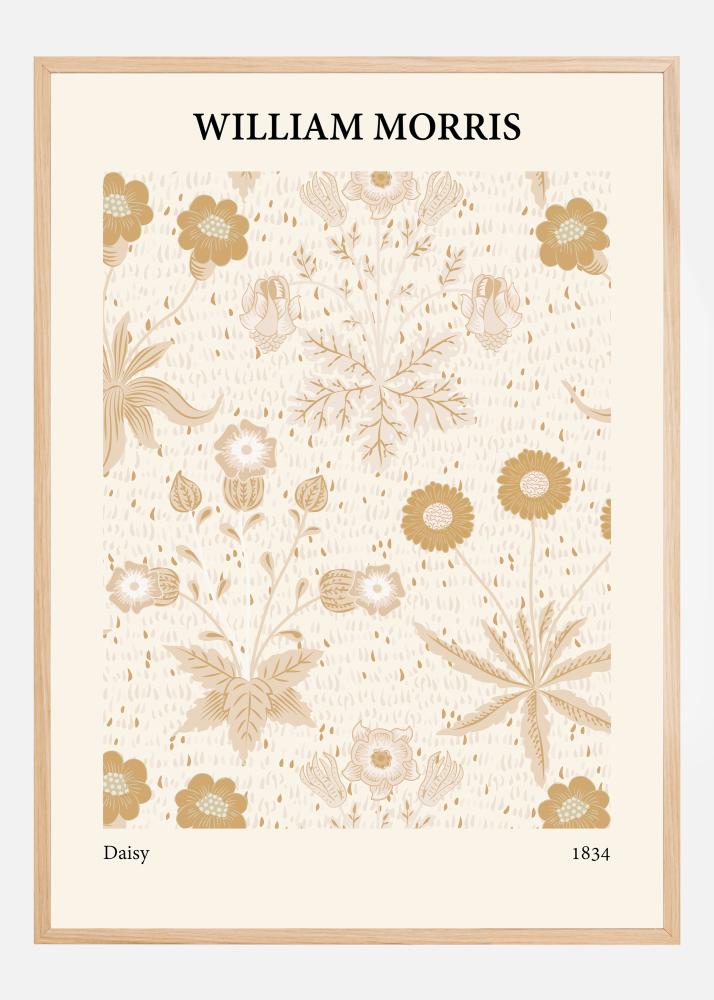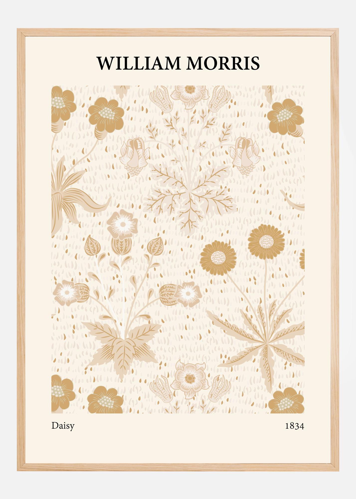 Този деликатен и стилен постер изобразява класически дизайнер на Уилям Морис, известен със своята вечна естетика и с мястото си в историята на изкуството. Моделът се състои от хармонична колекция от цветя и растителност, представен в мека и естествена цветова палитра. Дизайнът подчертава любовта на Морис към природата с детайлни изображения на маргаритки, незабравки и други ботанически елементи, чието разполагане върху хартията създава спокойно и балансирано впечатление. Цветовете, които доминират в мотива са нюанси на бежово, кремаво и различни кафяви тонове, които заедно придават топло и гостоприемно усещане на всяка стая.