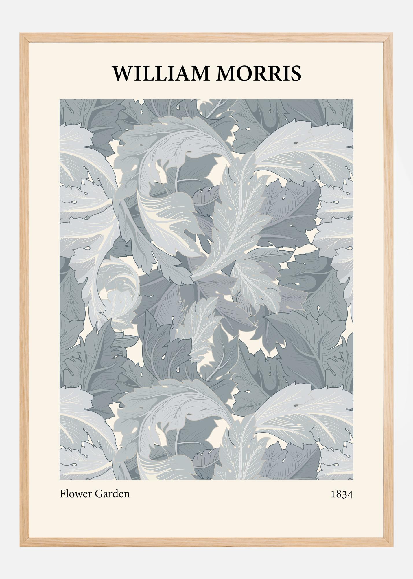 Този постер с неговия буен и изискан мотив на Уилям Морис предлага усещане за спокойствие и класическа елегантност. Дизайнът е ода на обилната зеленина, често асоциирана с Морис и неговата работа в движението Arts and Crafts. Мотивът, наречен "Цветна градина", съдържа плътна композиция от листа и цветя, представени в хладни тонове на синьо и сиво с нотки на кремаво бяло. Всяка подробност в този плакат е внимателно обмислена, създавайки усещане за добродетелна и подредена градина.