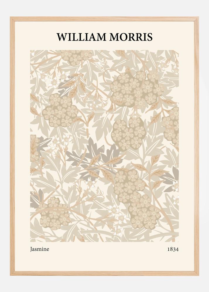 Този красив постер от Уилям Морис, озаглавен "Жасмин", е почит към класическата английска градина, пълна с ароматни цветя и буйна зеленина. Моделът е плътно преплетен с цъфтящ жасмин и други цветя, заобиколени от листа в различни форми и размери. Цветовата палитра е мека и земна, със смес от неутрални бежови и кафяви тонове на топъл кремав фон, което създава усещане за спокойствие и хармония в дома.