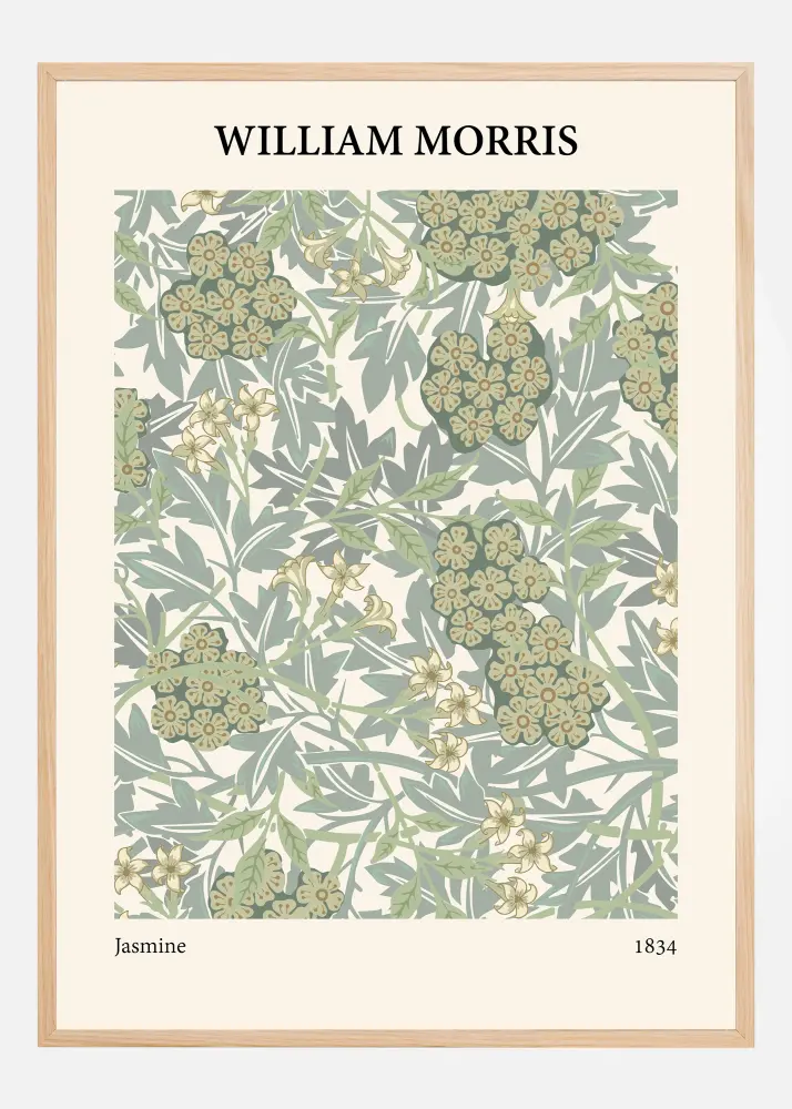 Плакатът "Jasmine" на Уилям Морис е демонстрация както на деликатното, така и на динамичното във флората на природата. Този печат е живописен със своята разливаща се структура от жасминови цветове и зелени листа. Моделът е съставен с изискана цветова палитра в зелено, бежово и жълто, които се съчетават, за да създадат усещане за плътна и привлекателна градина, готова за проучване и възхищение.