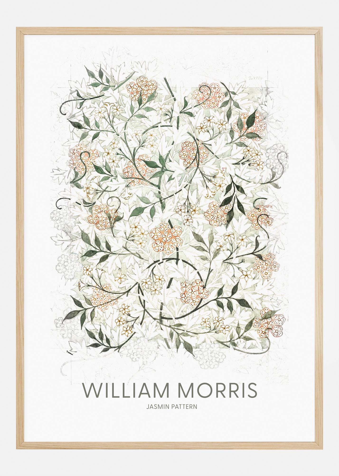 Този изискан плакат представя "Jasmin Pattern", още едно вечно произведение на известния дизайнер Уилям Морис. Моделът е красива композиция от жасминови цветя и листа, изработени с финес и внимание към детайлите, характерни за Морис. Цветовата гама е мека и естествена палитра, която подчертава нежните форми на цветята и листата на спокоен фон.