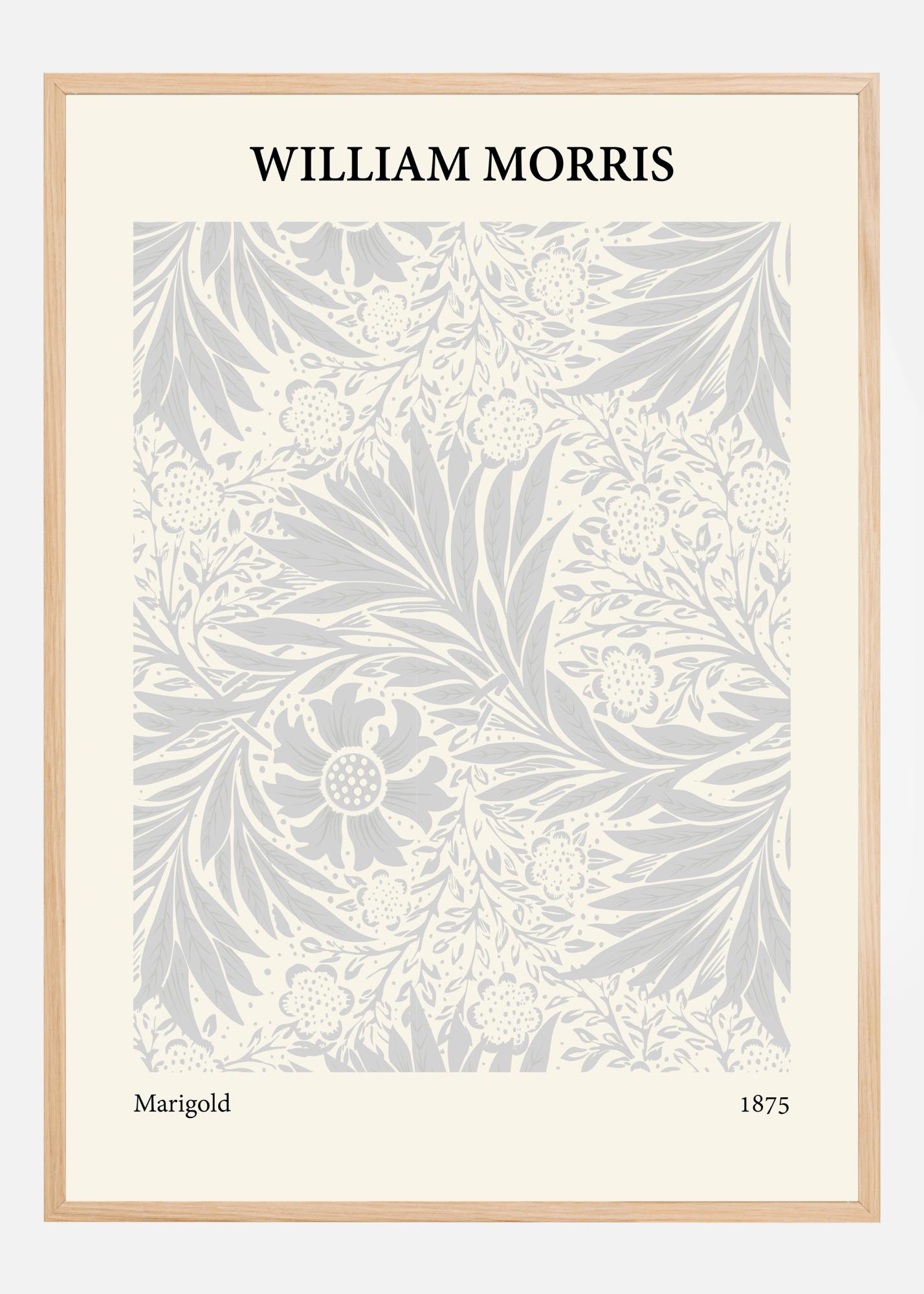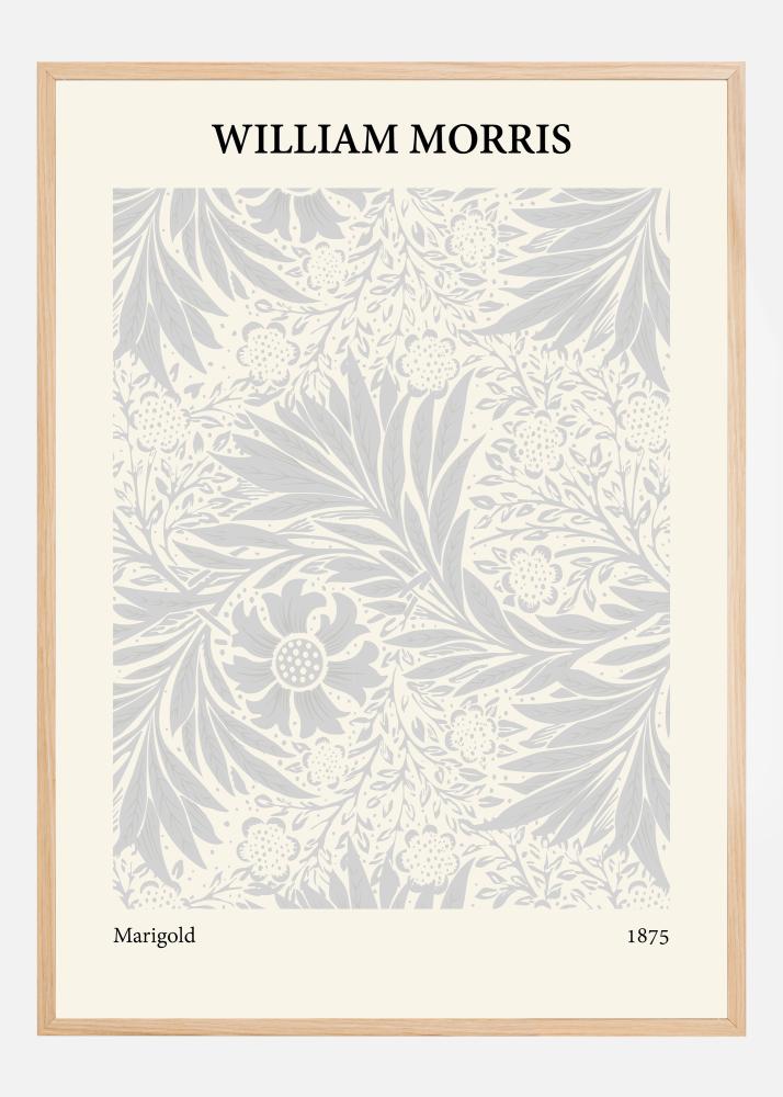 Този плакат е елегантно пресъздаване на "Marigold" на Уилям Морис от 1875 г. и внушава усещане за спокойствие и природна красота. Дизайнът е изпълнен с разцъфтяващи невени и деликатна листна украса, внимателно разположени в симетричен и привлекателен модел. Фината цветова комбинация от бледи сиви и бели тонове създава мека и приветлива естетика, която е характерна за работата на Морис.