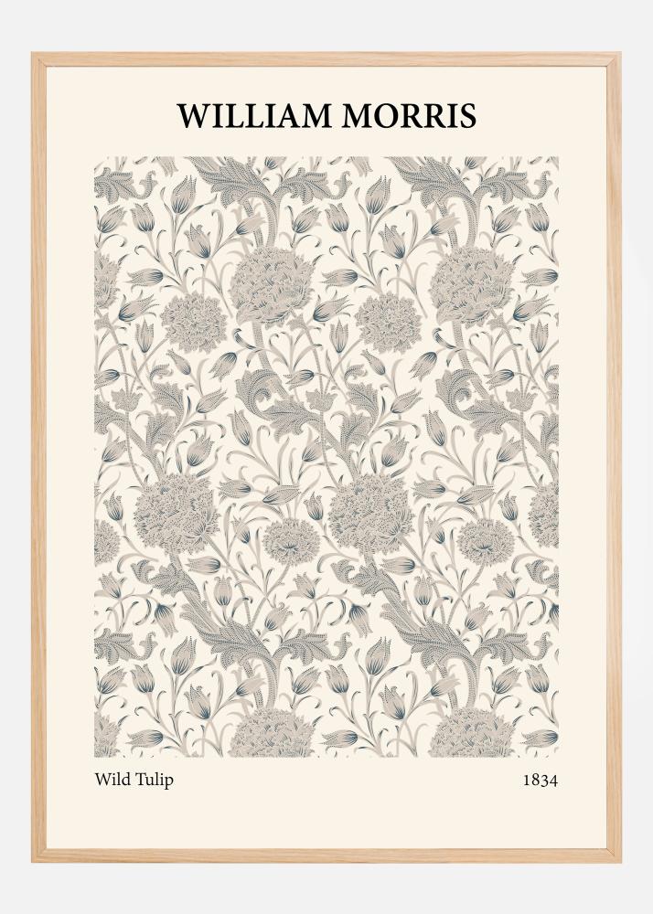 Този плакат на Уилям Морис, наречен "Див лале", е елегантна интерпретация на диви цветя, съставен с голямо умение и внимание. Моделът е лабиринт от лалета и листа, изпълнен в нежни нюанси на бежово и сиво върху топъл, кремав фон, което го прави идеално произведение за тези, които искат да създадат релаксираща и изискана обстановка. Детайлността на илюстрациите демонстрира майсторската ръка на Морис и неговата способност да превръща ежедневни гледки в изкуство.