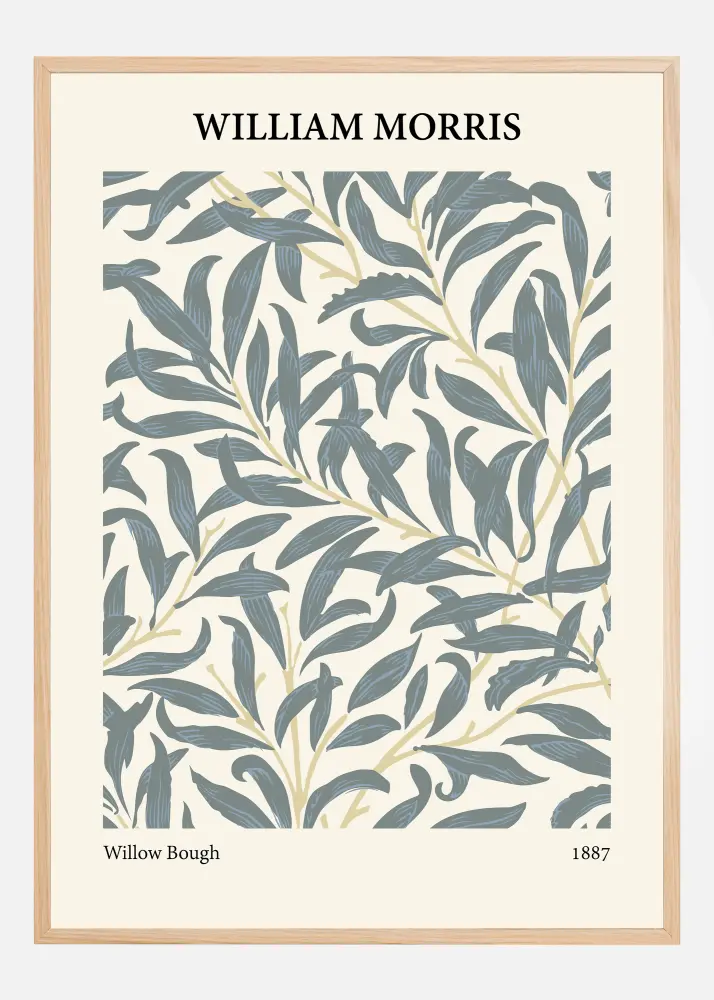 Този художествен плакат почита Уилям Морис и неговия вечен модел "Willow Bough" от 1887 година. Живописната и динамична композиция на върбовите листа срещу кремообразен фон е класическо представяне на любовта на Морис към природата и неговото умение да създава детайлни текстилни модели. Спокойната и хладна цветова палитра от синьо и зелено създава усещане за спокойствие и тишина, което прави този дизайн обичана класика.