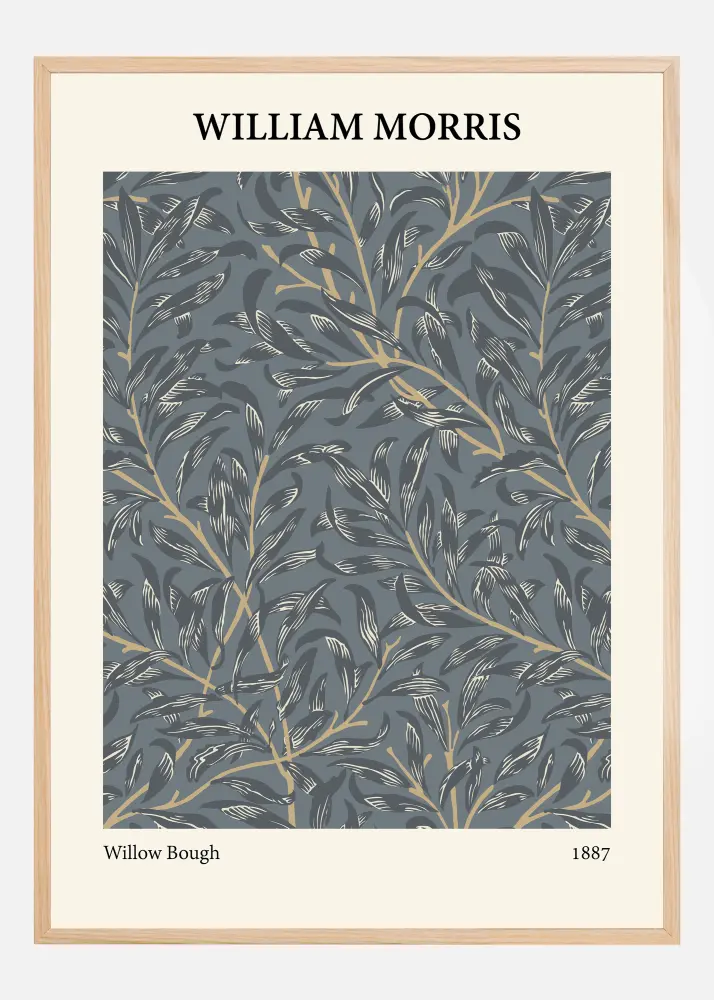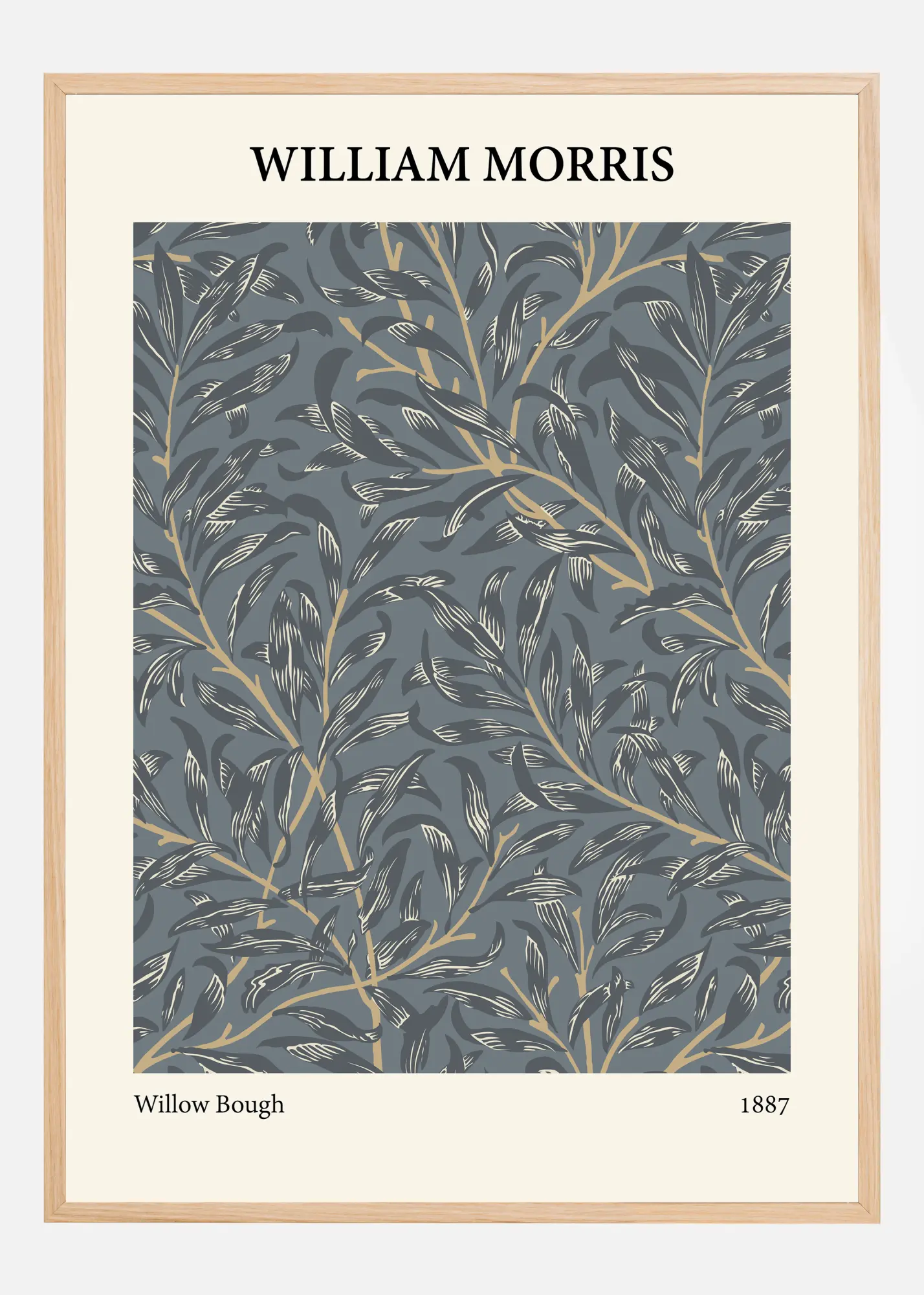 Това е впечатляващ плакат, който подчертава класическия модел "Willow Bough" на Уилям Морис от 1887 година. Извиващите се върбови листа са изкусно изработени в нюанси на синьо и сиво, които елегантно контрастират с линии в топъл златист тон. Тази комбинация носи богатство и дълбочина на цялостния дизайн и е доказателство за майсторството на Морис и неговото трайно влияние в дизайна на модели.