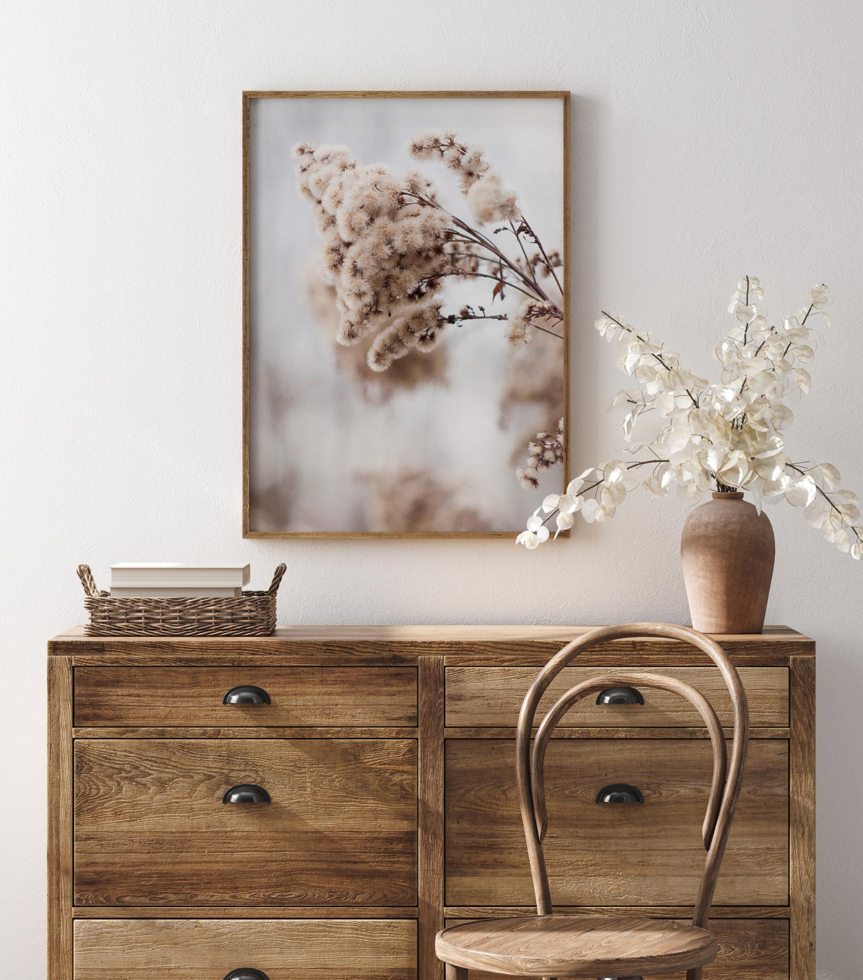 Флорален постер с няколко меки кръгли цветни пъпки на клонка. Розовото на тези цветове се откроява на фона на меко синьо и сиво. Възхищавайте се на детайлите във всяка една от тези пъпки, докато те висят в тази зимна сезонна картина.