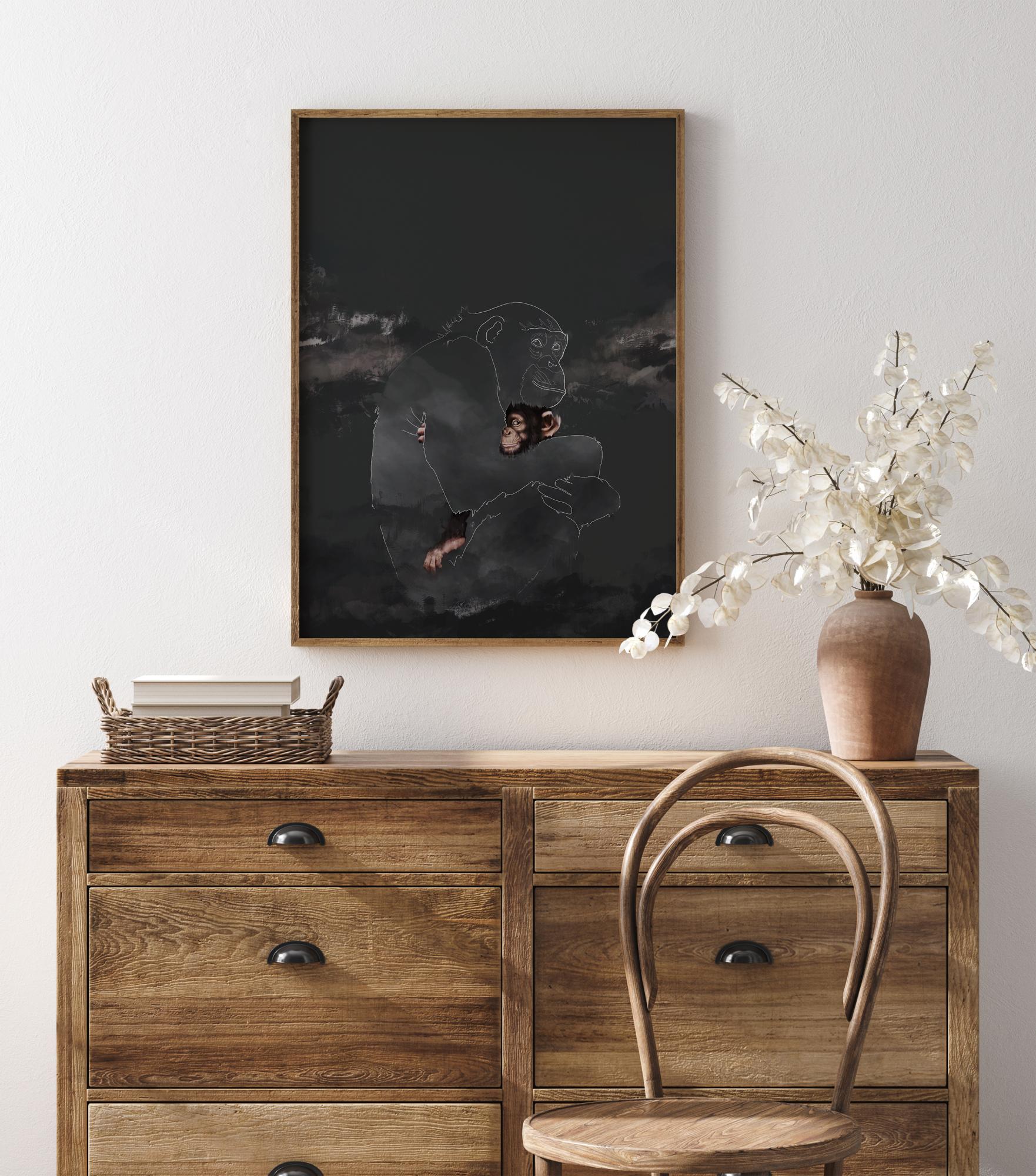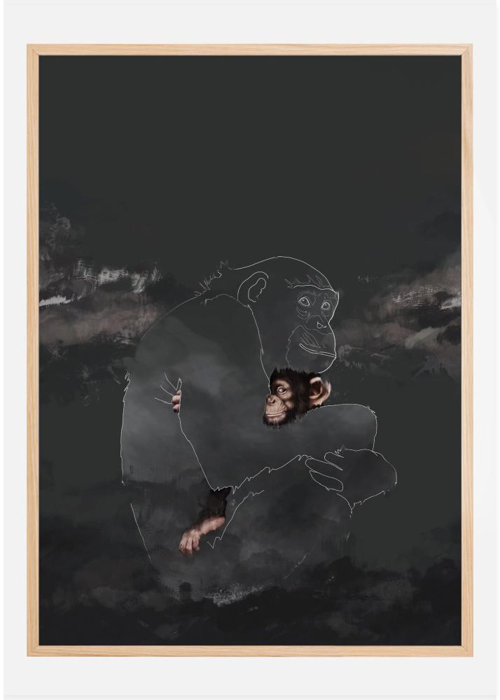 Емоционален постер с бебе шимпанзе, което прегръща липсващата снимка на своята майка. Това е трогателно изображение, когато малкото шимпанзе прегръща нищо друго освен контурите на своята майка, която седи на меки облаци в черното небе.