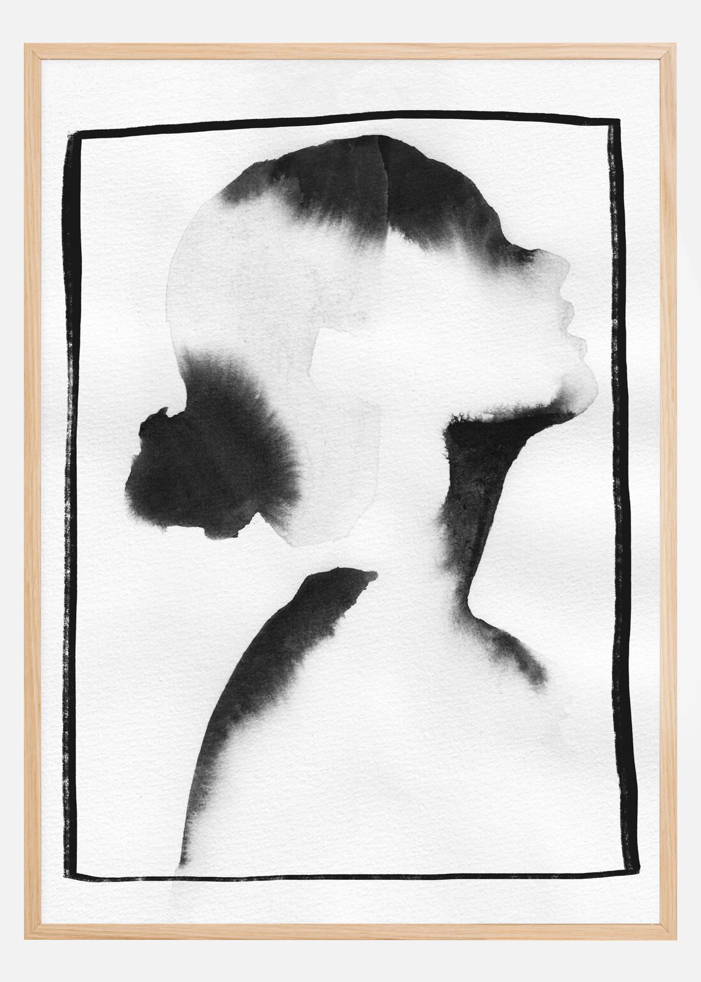 Мек акварелен постер с профил на жена. С помощта на мека акварелна техника косата и лицето на жената се създават, като се оставя цветът да се разпространи с водата. Това създава въздействащо черно-бяло изображение, което ще изглежда добре на светъл фон.