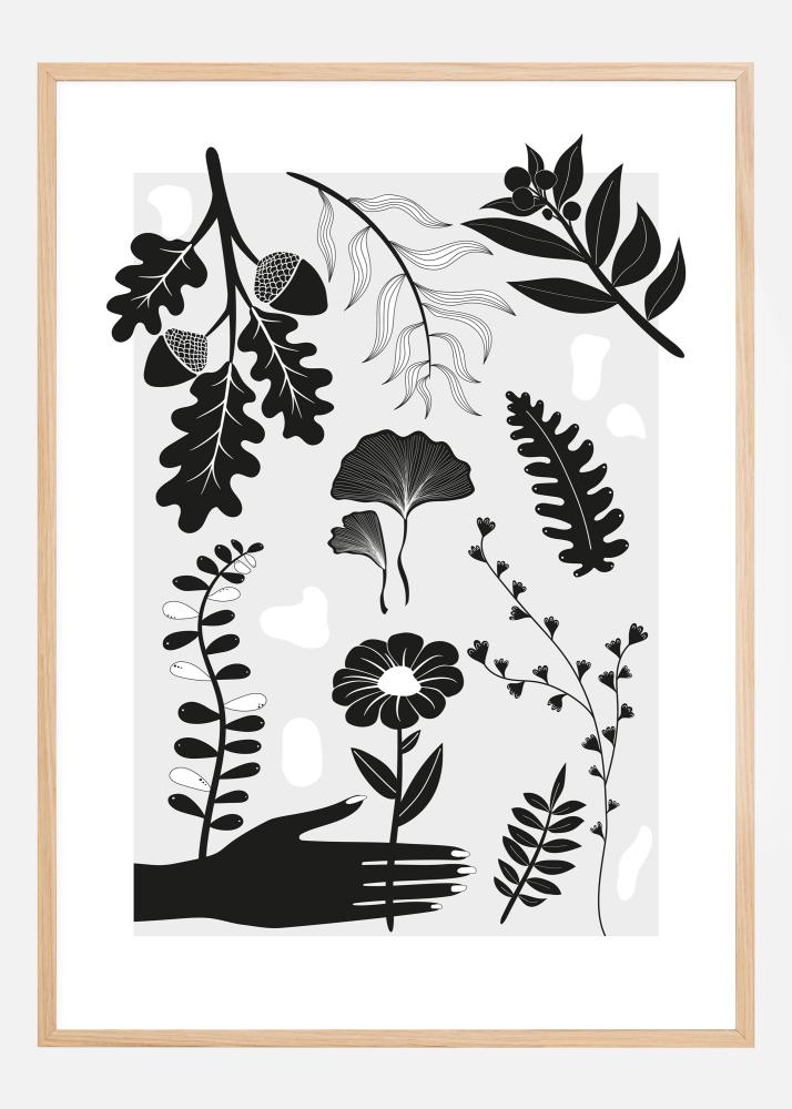 Смел постер с черно-бели фигури на различни листа, растения и цветя. Черна ръка се протяга, за да хване едно от стилизираните цветя. Жълъди, цветя, папрати и други запълват този семпъл, но интересен принт. Влезте в ботанично настроение, когато закачите този растителен постер в дома си.
