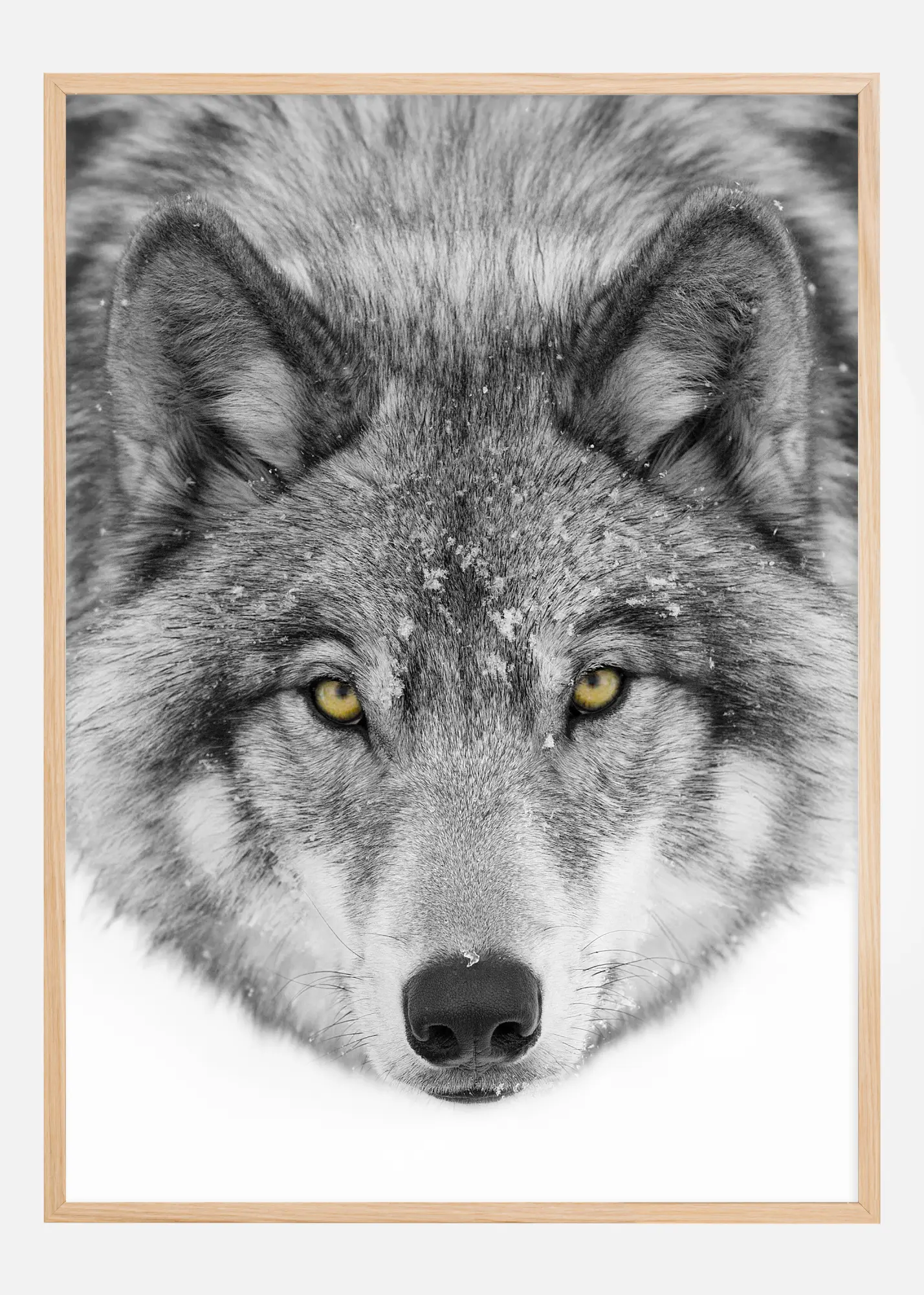 Този завладяващ постер изобразява близък план на вълк, където проникващите жълти очи на животното са във фокус на снежно бял фон. Детайлизираното палто на вълка и снежинките, които нежно са се спуснали върху него, предават усещане за неговото естествено обиталище и красота на дивия живот.