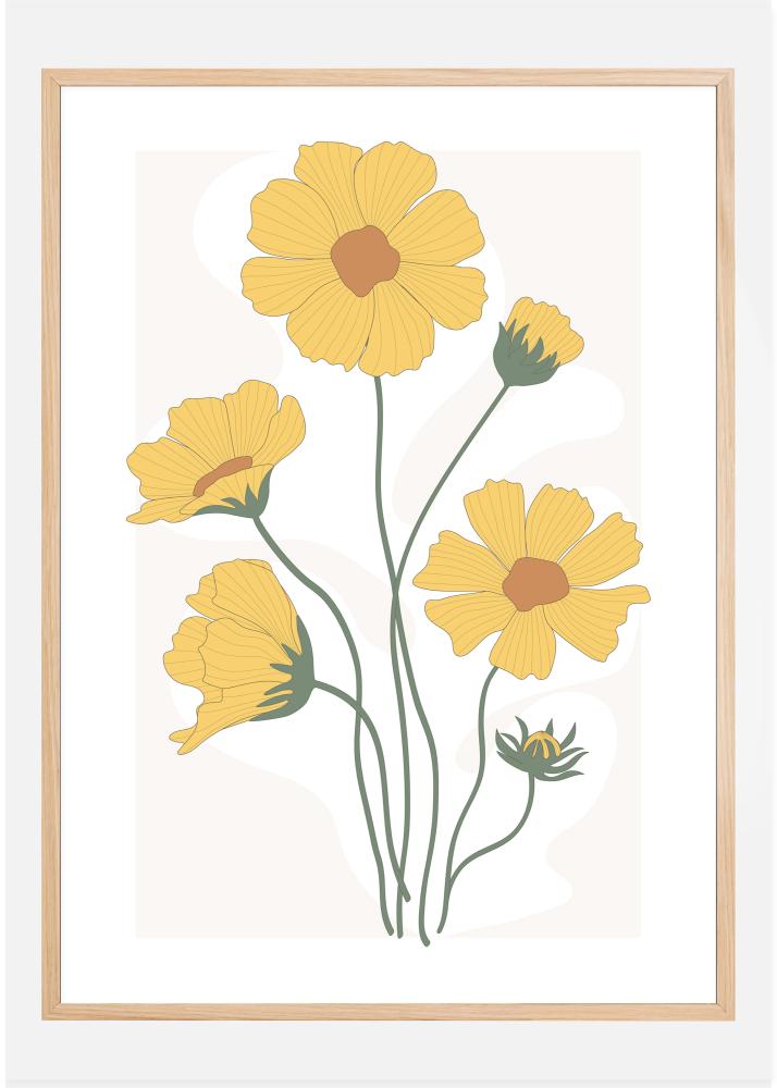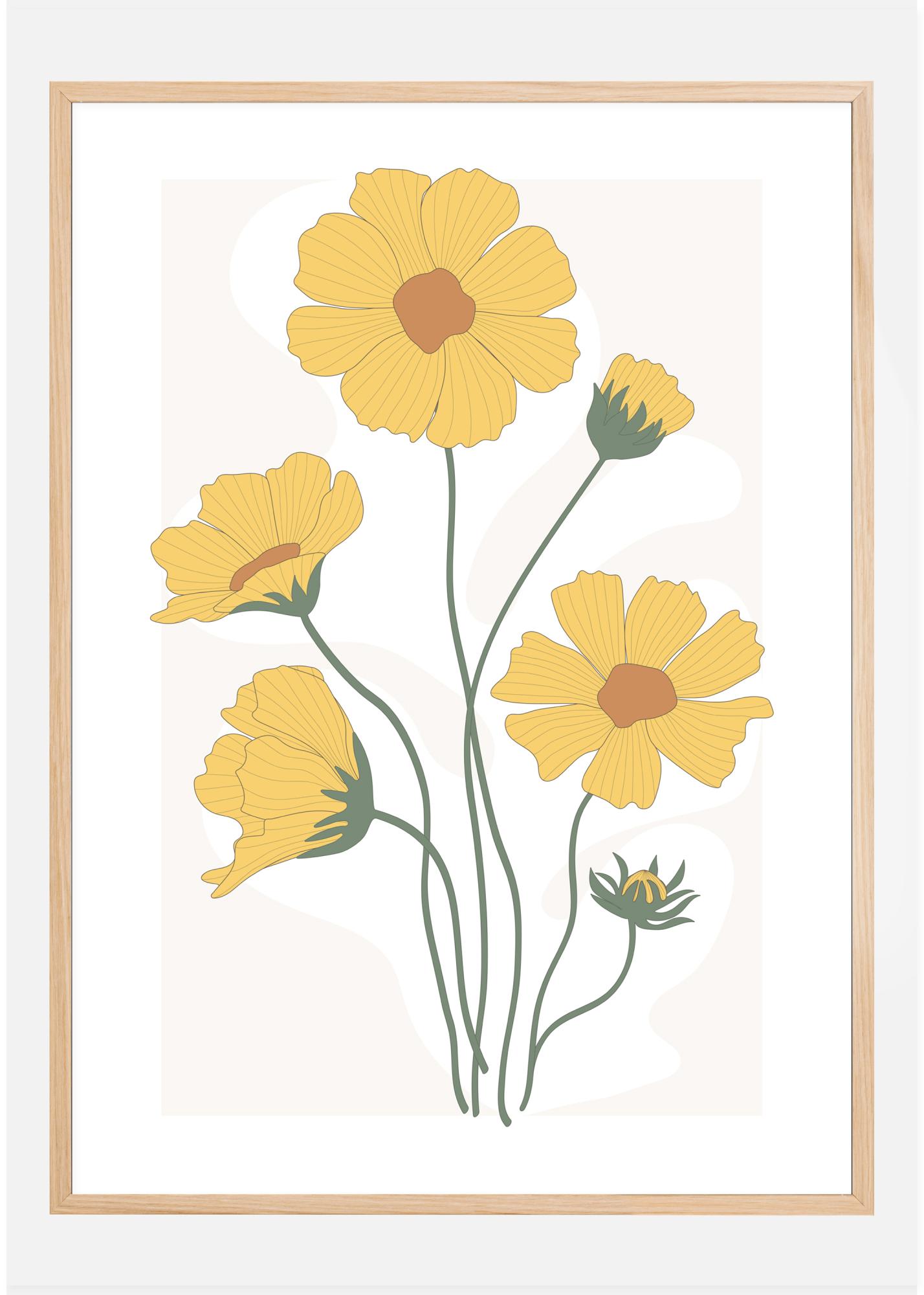 Ярък постер с жълти невени, създаден в забавен печатен стил. Всяко от цветята сияе на белия фон. Въпреки че е със семпъл стилизиран дизайн, цветята са весели и са перфектният начин да се събудите с усмивка на лицето си.