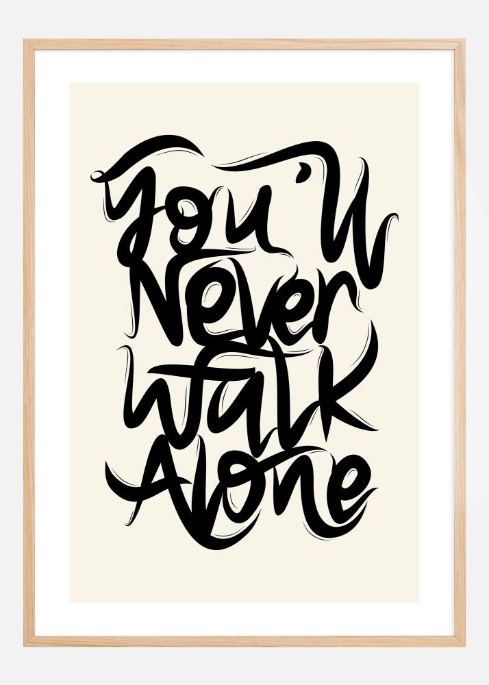 Този мощен плакат представя игрива и артистична калиграфия на фразата "You Never Walk Alone" в почернен текст върху топъл, кремав фон. Течният и динамичен стил на типография показва думите, които са преплетени, придавайки усещане за движение и съпричастие. Дизайнът умело балансира между четливост и артистична свобода, правейки текста както носител на послание, така и естетически обект сам по себе си.