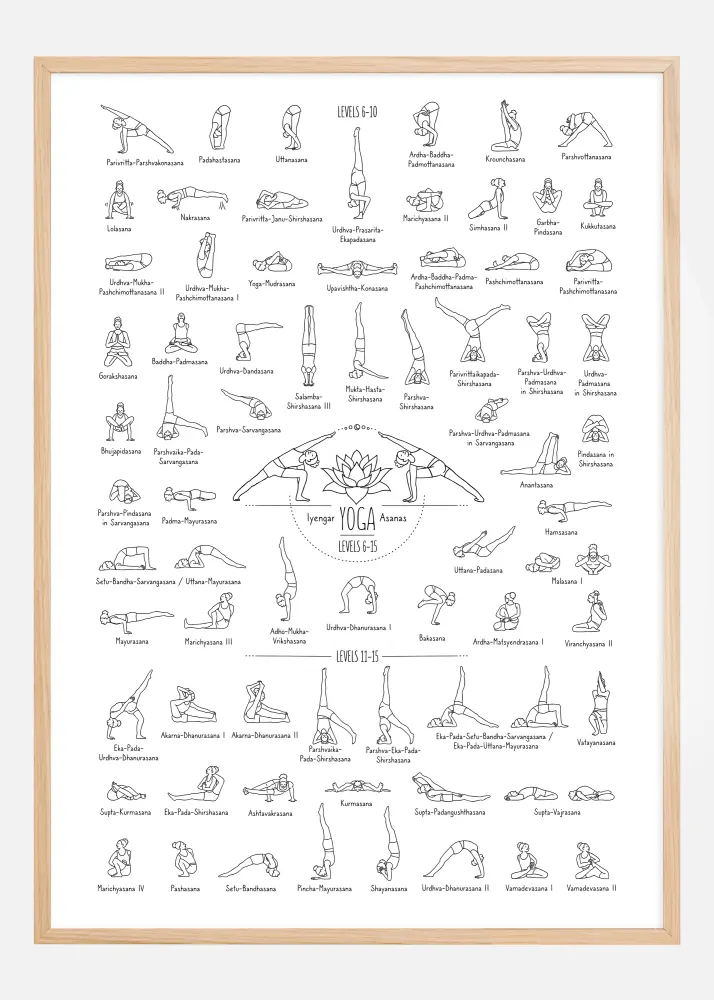 Този изчерпателен и обучителен постер предоставя визуално ръководство за Iyengar Yoga Asanas за нивата от 6 до 15, представен в ясно и методично оформление. Детайлните илюстрации са възпроизведени с прецизни линии, които подчертават уникалните форми и позиции на всяка йога поза. Над всяко изображение има името на асаната на санскрит, което улеснява практикуващите на всички нива да идентифицират и упражняват всяка позиция.