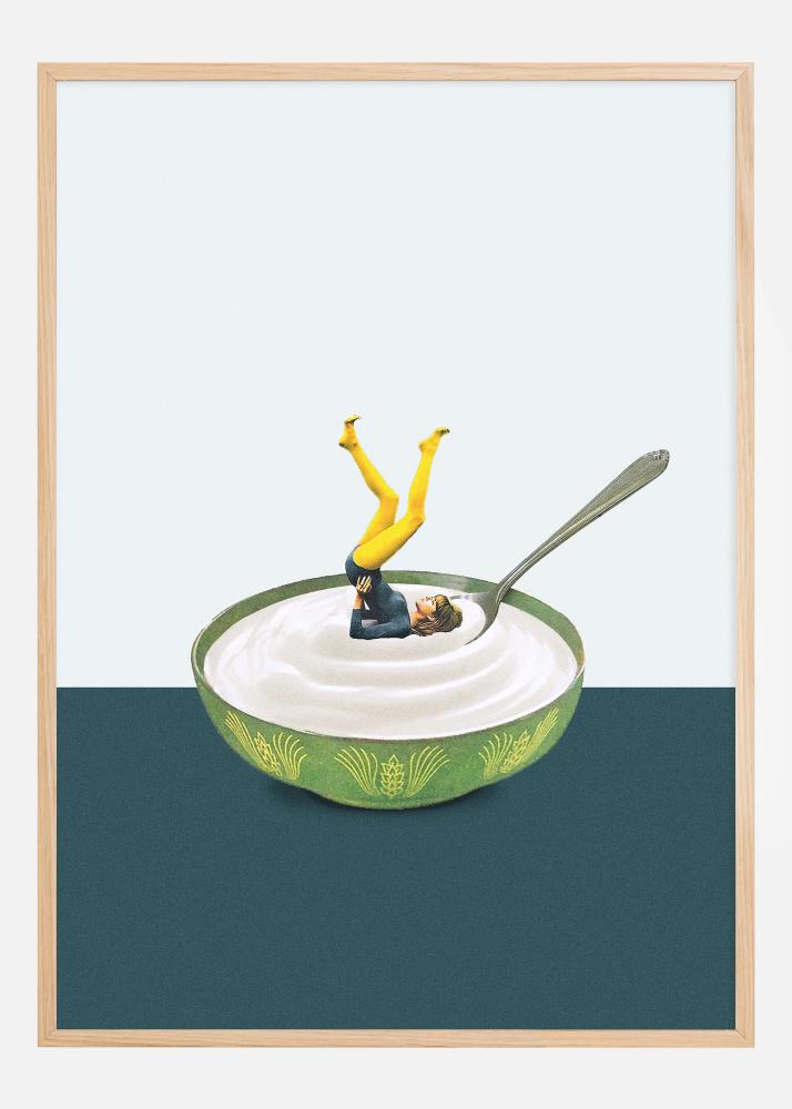 Този уникален и игрив постер представя хумористична картина на човек, който изпълнява йога поза потопен в купа с кисело мляко, завършен с чифт игриво жълти панталони, които съответстват на обърнатата позиция. Креативното изображение комбинира елементи на сюрреализъм и ежедневен хумор и е освежаващо отклонение от традиционното изкуство и декорация. Фонът с два тона допринася за подчертаване на необичайната композиция и го прави старт на разговор.
