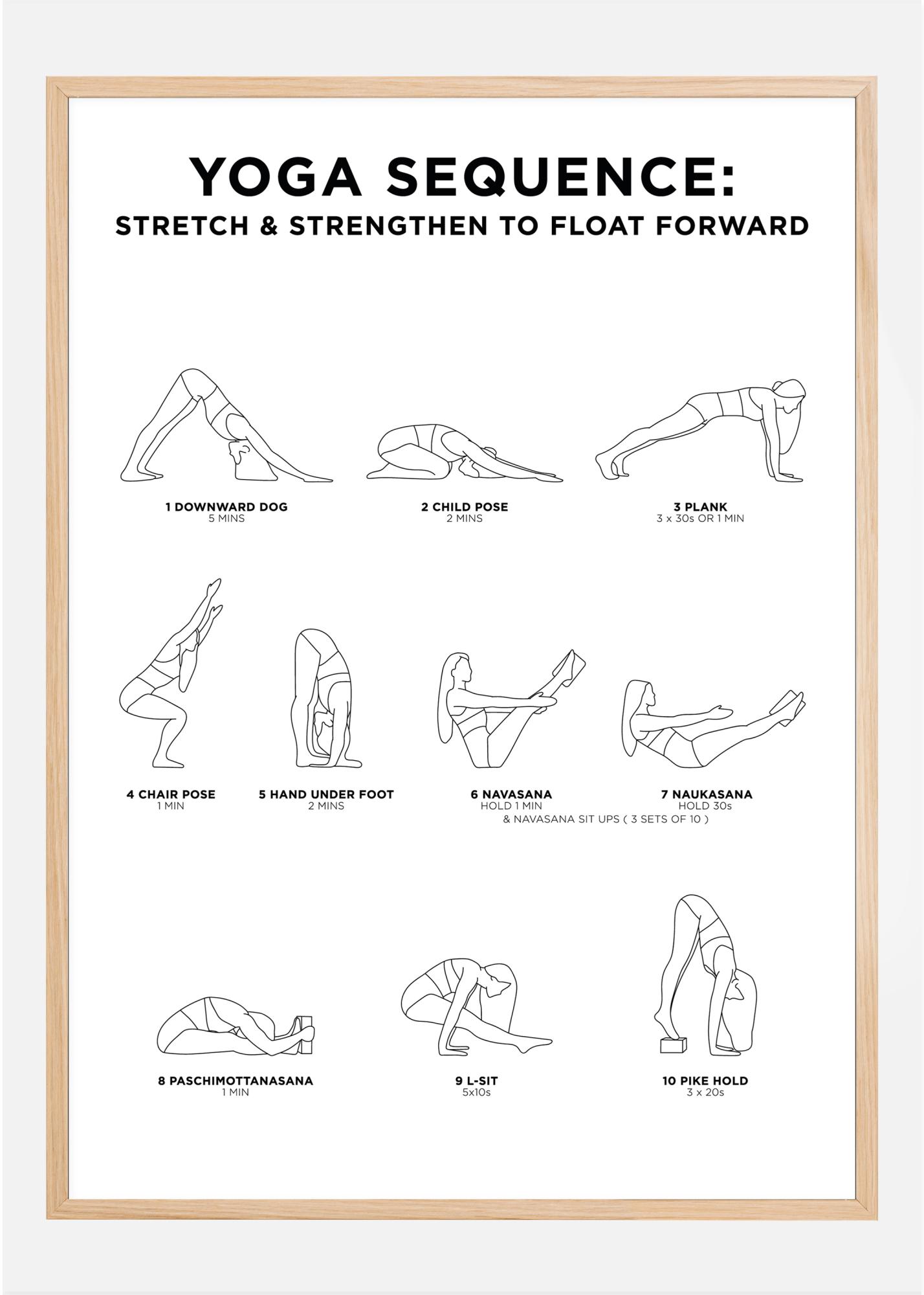 Този постер има стилен и изчистен дизайн, но също така е много полезен, ако искате да научите йога с акцент върху разтягането и силата. Постерът ясно показва как трябва да се изпълняват позициите в йога последователност, както и колко дълго трябва да се задържи всяка позиция.