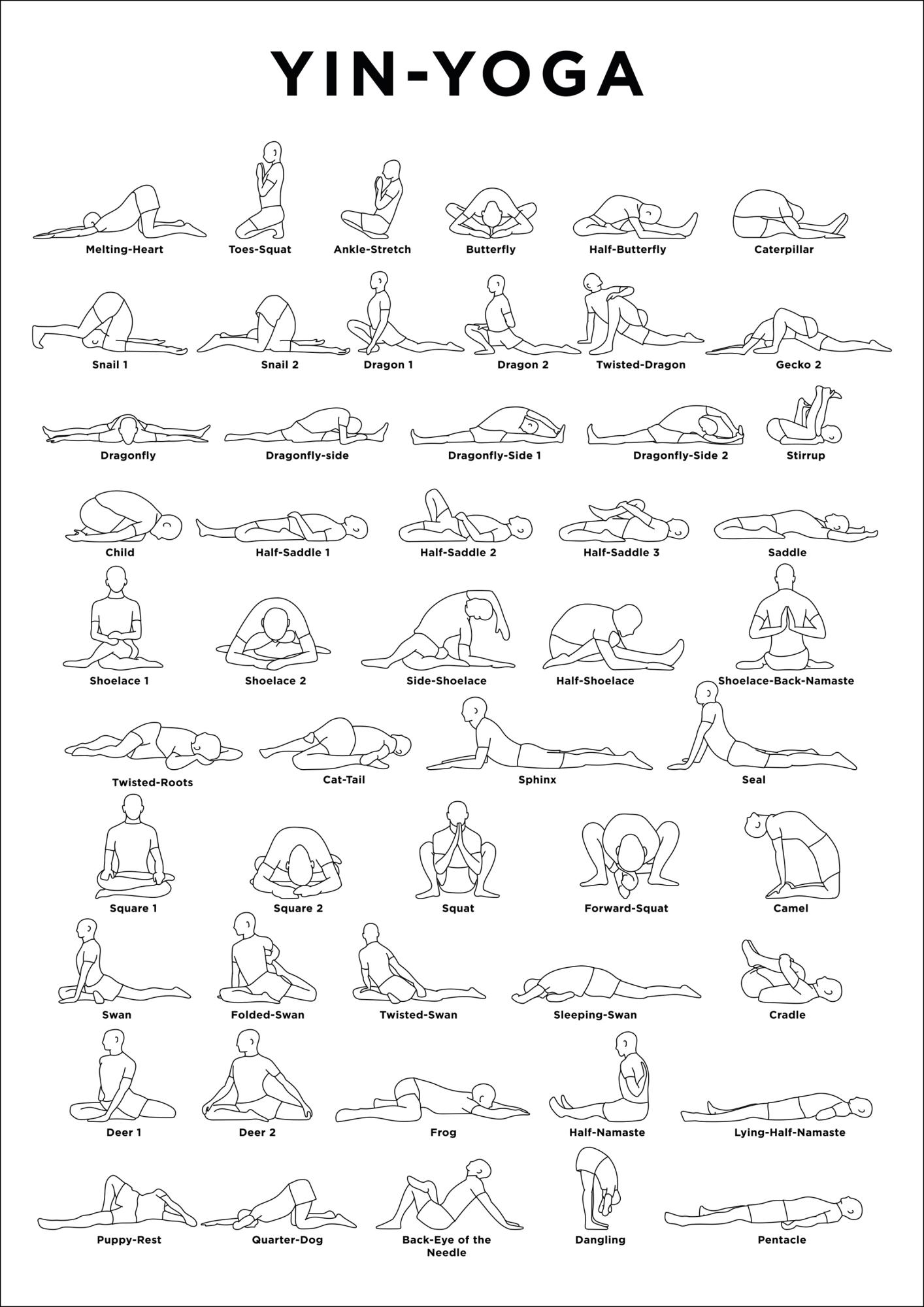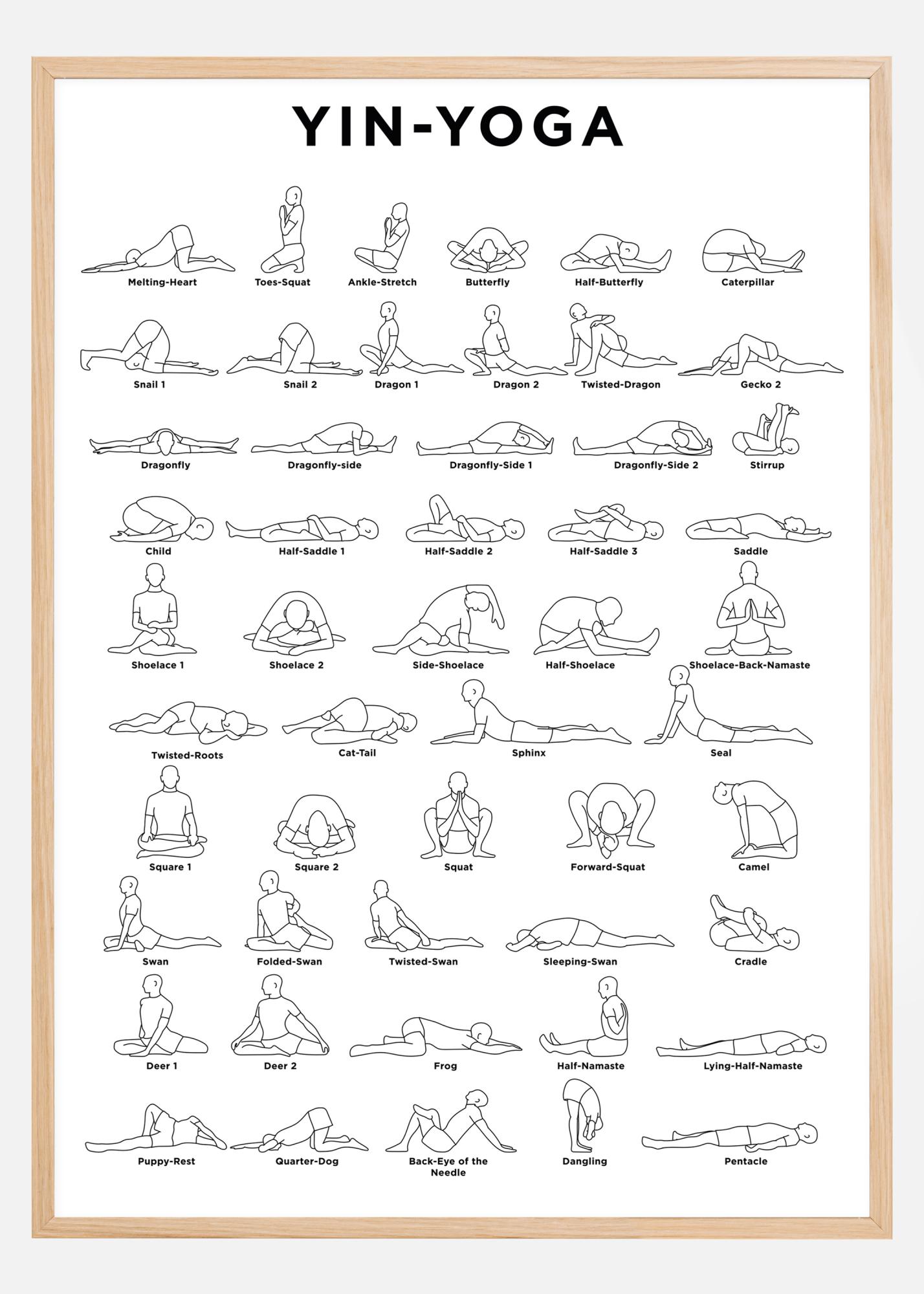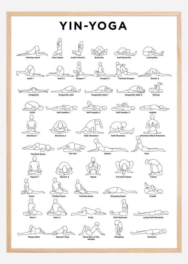 Забавен дизайнерски постер, който показва различните позиции в йога, които можете да научите. Бялото изображение има всяка фигура нарисувана в черно, която седи или лежи в различни позиции, с името написано отдолу. Закачете го там, където можете да го виждате в дома си и следвайте всяка позиция, за да направите правилни разтягания.