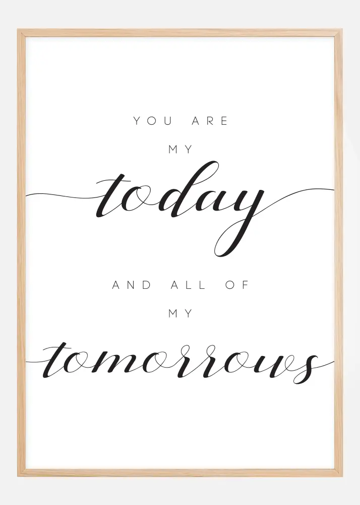Мотивиращ плакат със силен цитат, който да ви вдъхновява всеки ден. You Are My Today and All of My Tomorrows е перфектният подарък за любим човек, за да покажете колко много го цените. Поставете го на място, където да го виждат всяка сутрин.