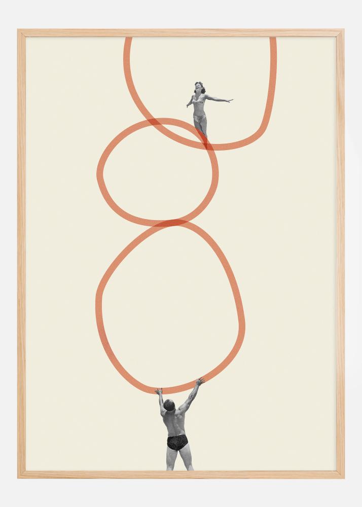 Този уникален плакат представя композиция, която прилича на танц от контури и човешко взаимодействие. Изображението показва човек в плавно движение, балансиран от друга фигура, стояща здраво и стабилно на земята, като и двете са обрамчени от течащи теракотено-червени кръгове, създаващи усещане за движение и непрекъснатост.