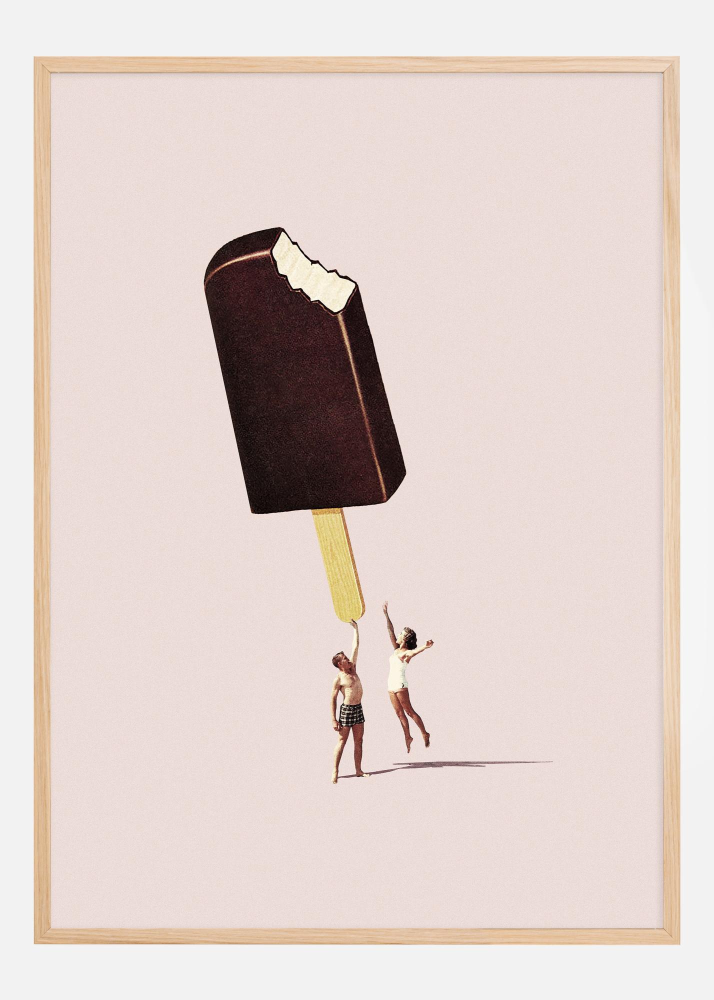 Този очарователен плакат показва уникална и игрива картина на двама души, които сякаш са открили гигантски сладолед на пръчка! Със своето въображаемо композиционал и топъл пастелно розов фон, това изображение предлага усещане за лятно щастие и носталгия. Веселите фигури, облечени в прости бански костюми, посягат към сладоледа, който има реалистичен вид с ухапана част, създавайки прекрасен контраст спрямо минималистичната обстановка. Тази креативна и жива сцена привлича вниманието на наблюдателя и събужда спомени за слънчеви дни.