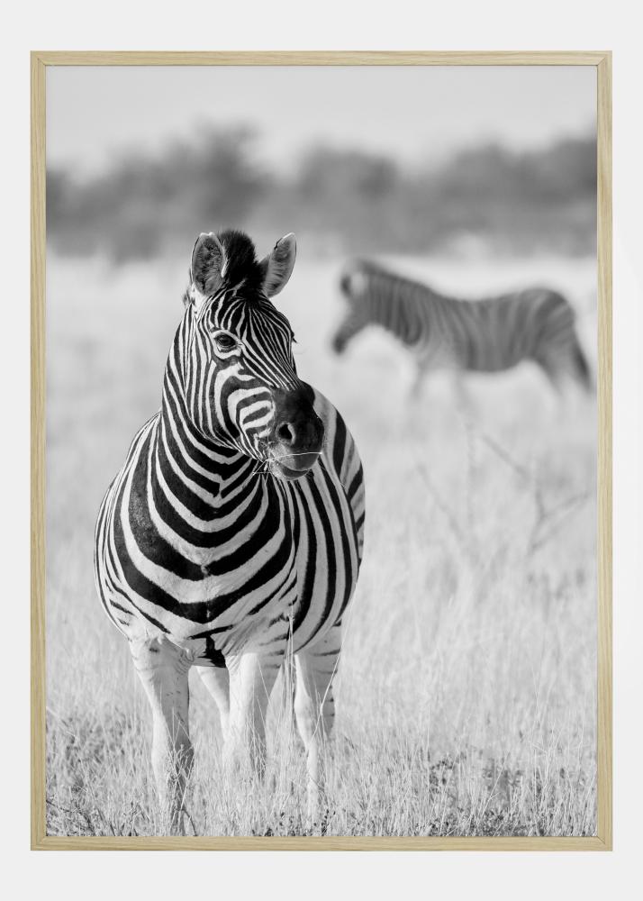 Детски плакат с изображение на зебра в африканските равнини. Дързка зебра стои на пост на преден план, докато друга преминава в далечината. Пътувайте до Африка всеки ден, докато мечтаете с този спокоен печат.