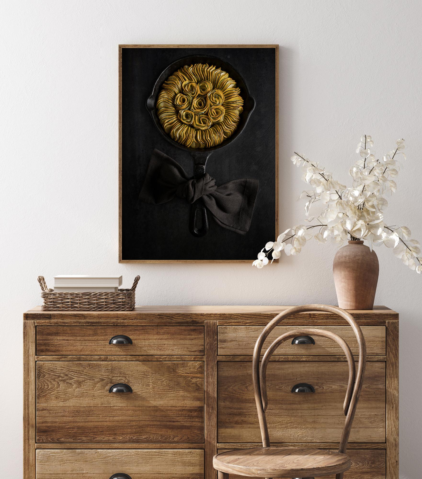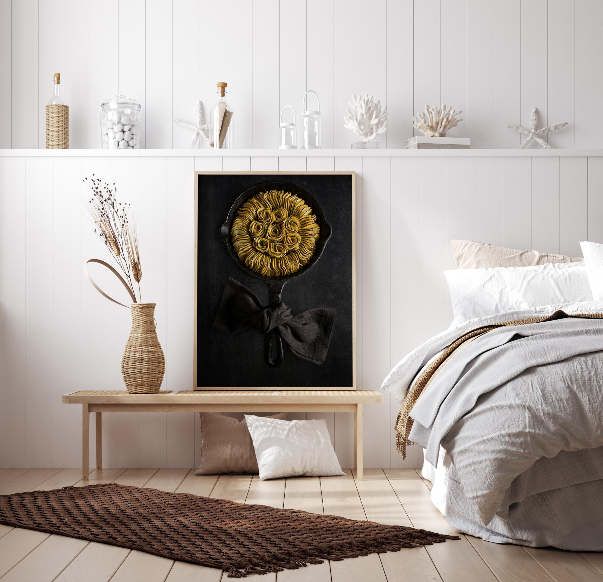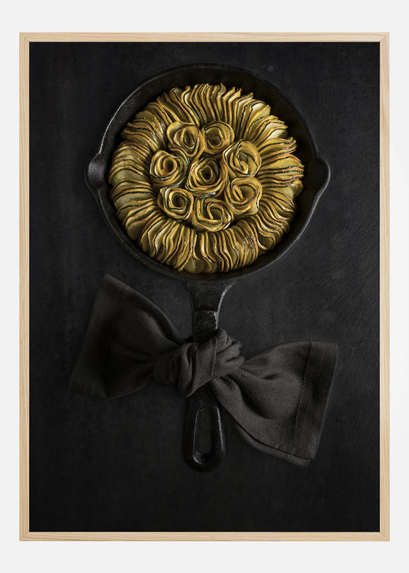 Изискан плакат с рататуй от тиквички или тиква, елегантно наредени в чугунен тиган, създавайки невероятна слънчогледова форма. Жълтите и зелените тиквички изпъкват върху черния тиган с текстилна лента, завързана около дръжката. Закачете това в кухнята си и вижте дали можете да приготвите това изкушаващо ястие.